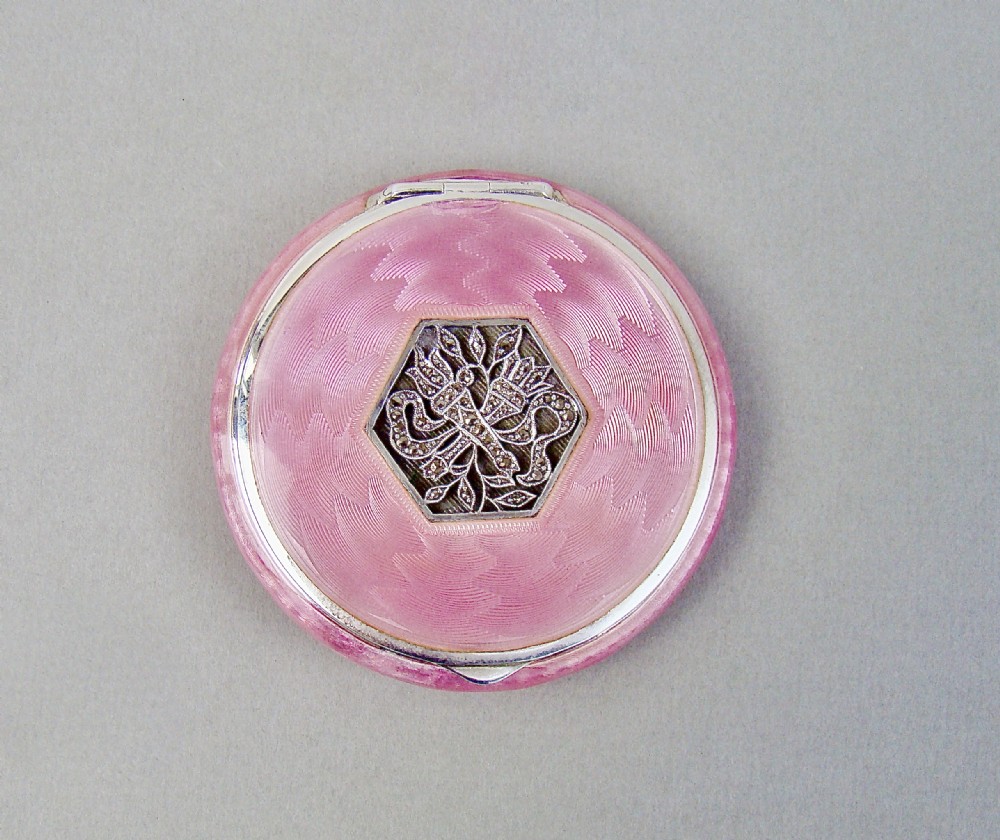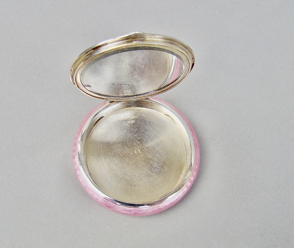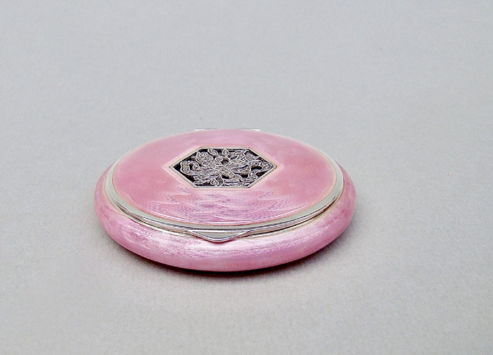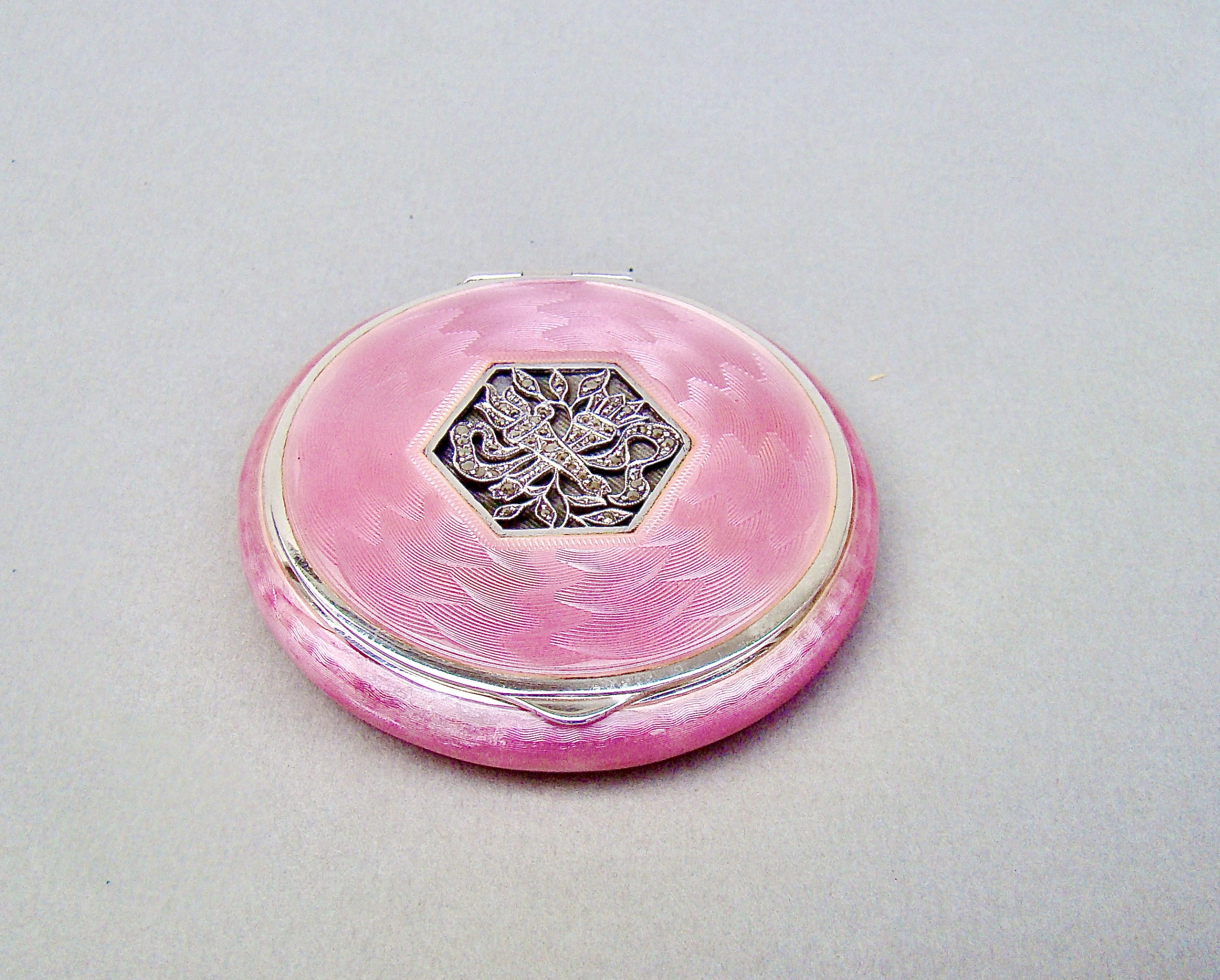 This exquisite and unusual continental silver and guilloche enamel compact has import marks for Glasgow 1929 and is further hallmarked by F B Reynolds, who specialised in imported items. It is enamelled all over: front, back and sides. always a sign of quality. The hinged lid inset with a pierced hexagonal reserve applied with marcasite decorations. The inner lid with the original mirror. It is a beautiful and tactile piece.