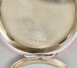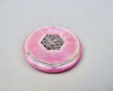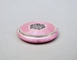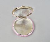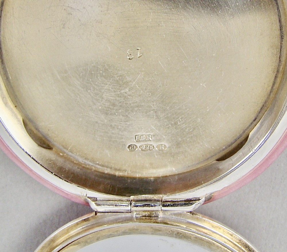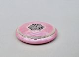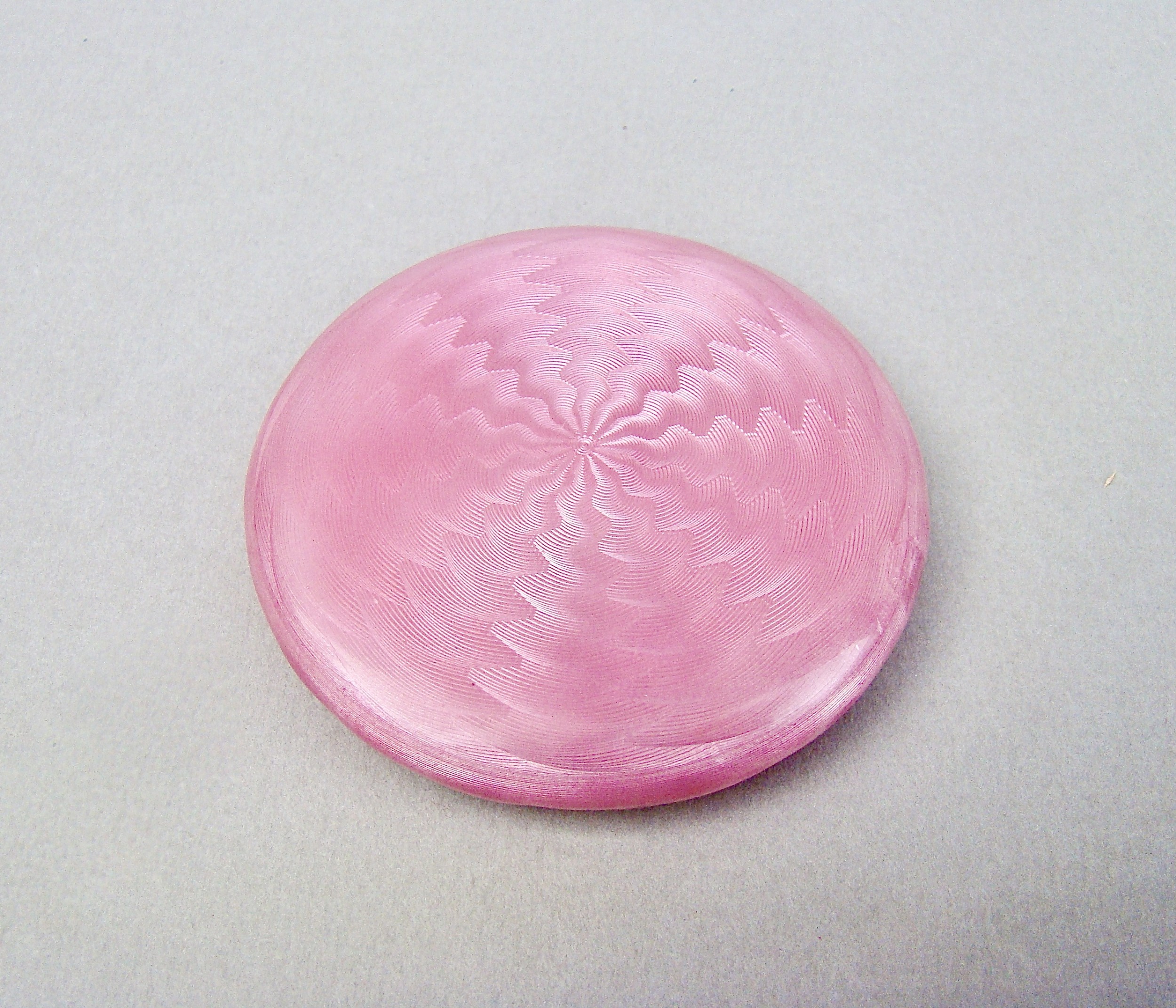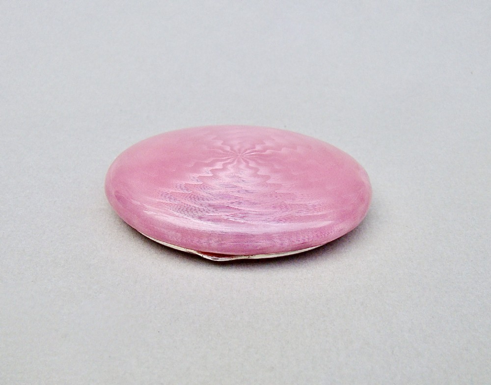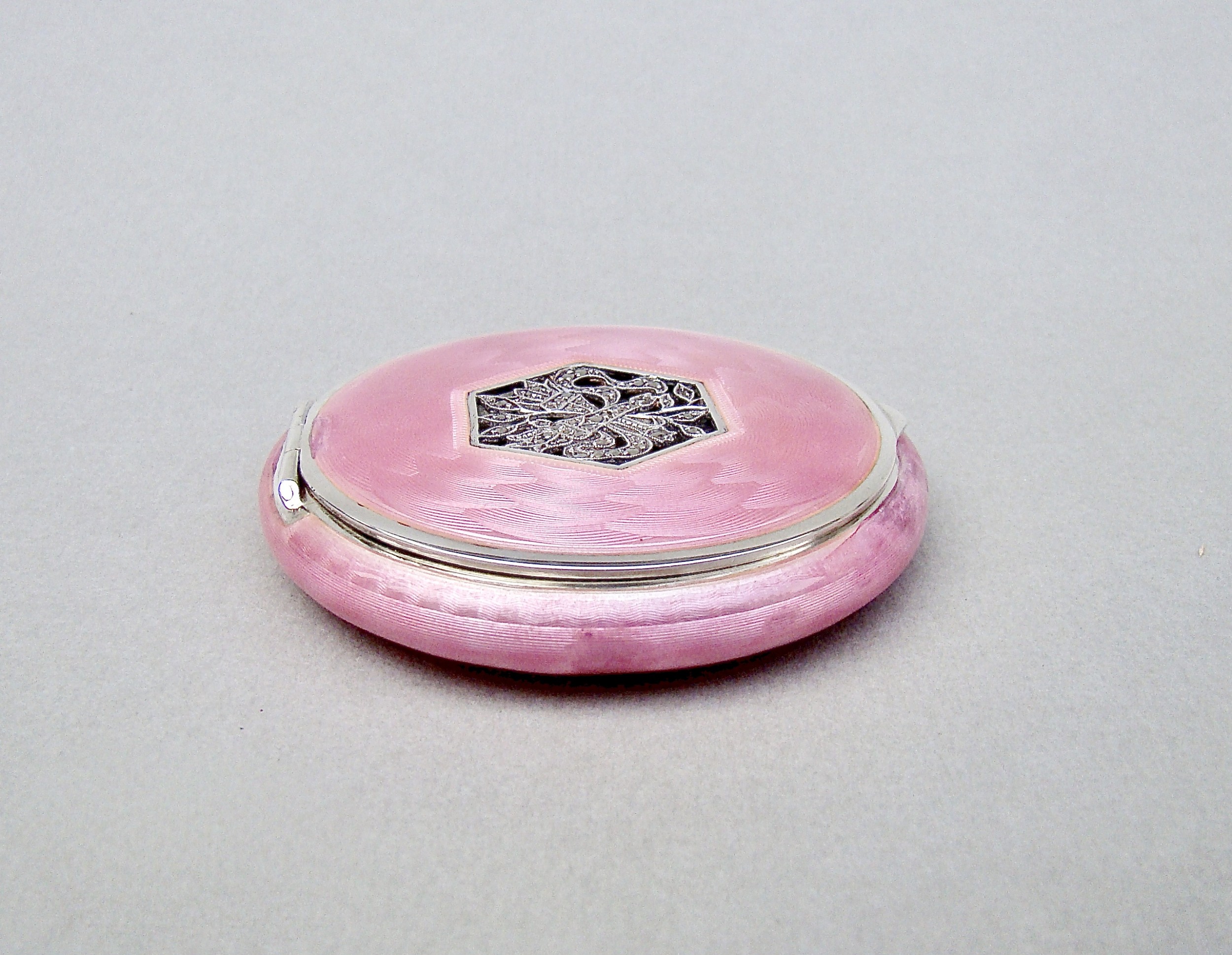 This exquisite and unusual continental silver and guilloche enamel compact has import marks for Glasgow 1929 and is further hallmarked by F B Reynolds, who specialised in imported items. It is enamelled all over: front, back and sides. always a sign of quality. The hinged lid inset with a pierced hexagonal reserve applied with marcasite decorations. The inner lid with the original mirror. It is a beautiful and tactile piece.