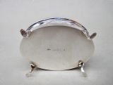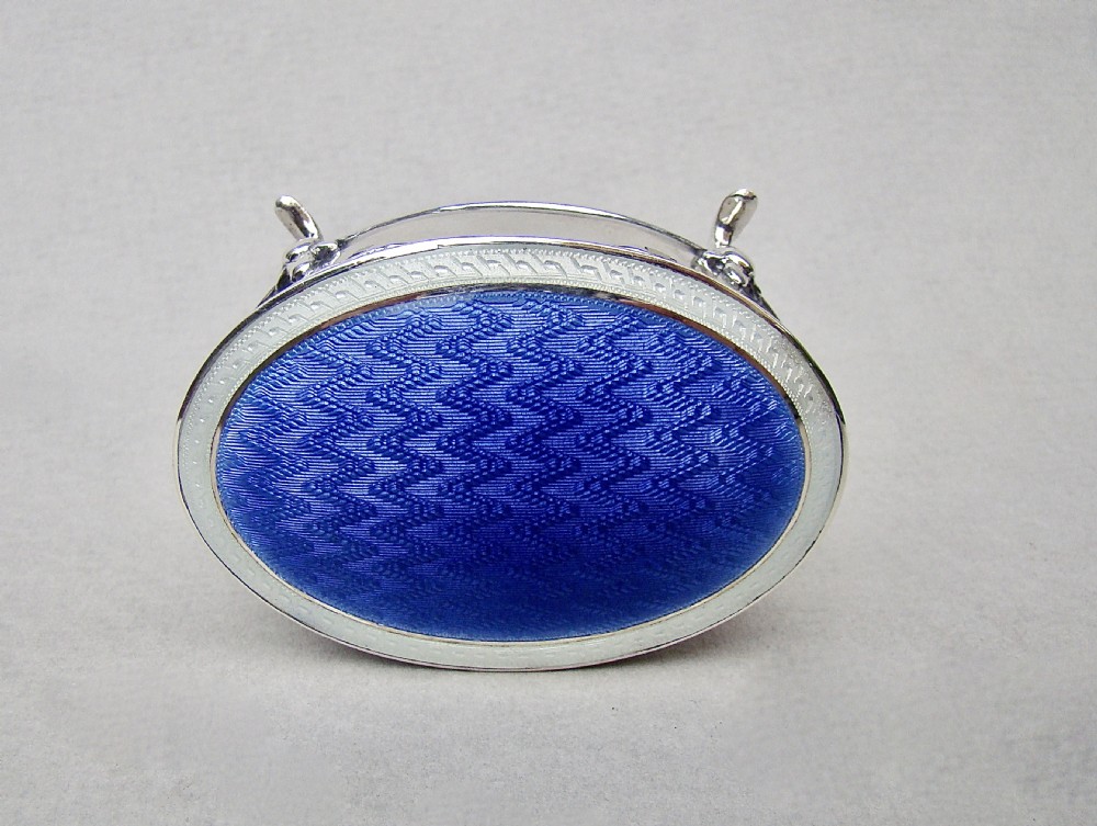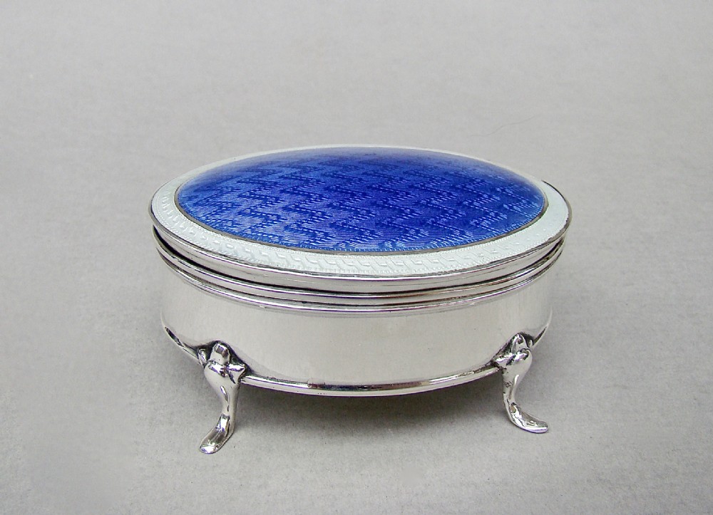 This fabulous and rare Edwardian silver mounted dual colour guilloche enamel jewellery box is dated Chester 1908 and was made by Charles Edwin Turner. Of oval form, the cover with a vivid blue engine-turned guilloche enamel background and surrounded by an elegant silver rimmed white border. The hinged cover opening to reveal a gilt interior. Raised on four elegant cabriole legs. The base solid silver and fully hallmarked.