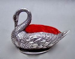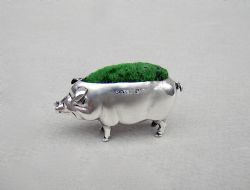 This is a very rare Edwardian Novelty silver Pin Cushion modelled as a donkey pulling a mother of pearl, two-wheeled, articulated cart. The donkey exquisitely and realistically modelled retains its original cushion. The mother of pearl cart a lovely shape.