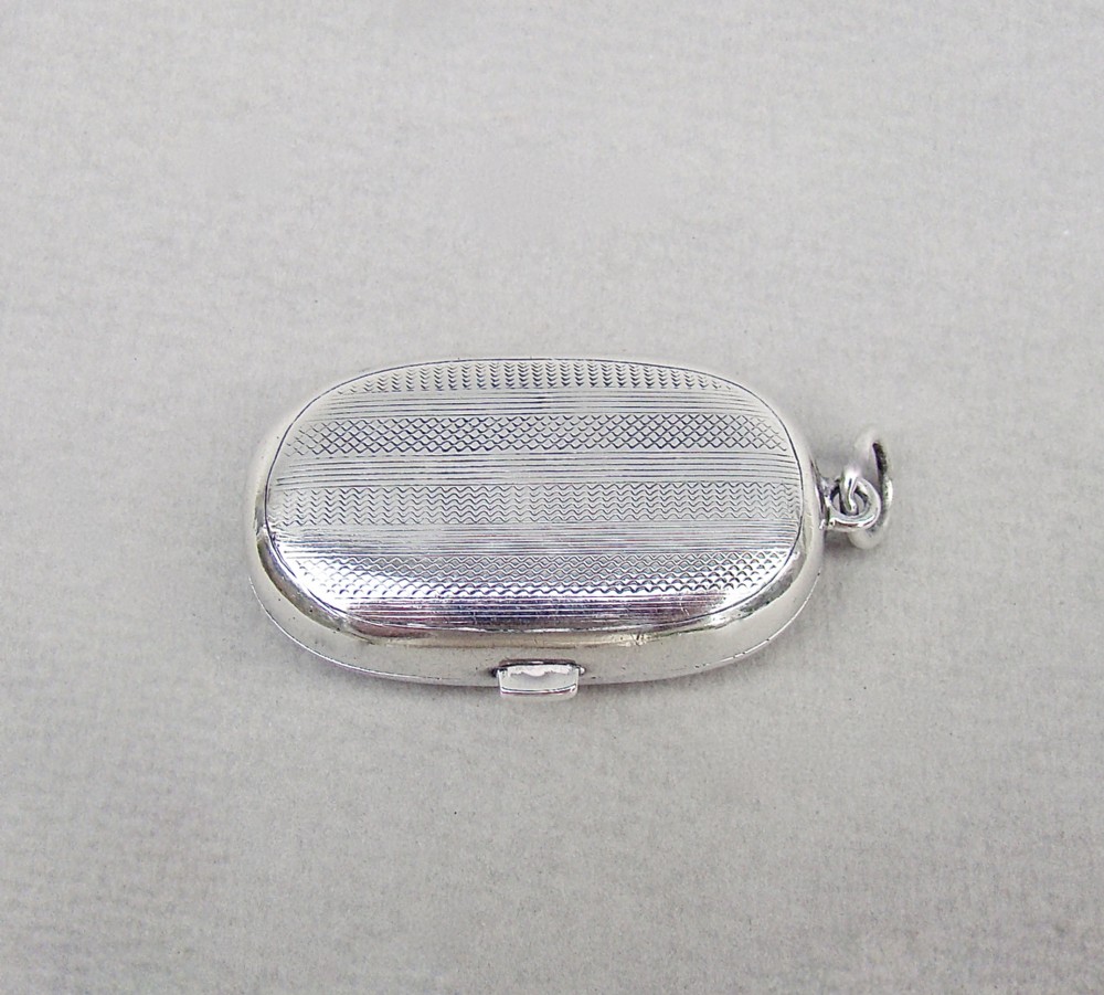 This stylish silver double sovereign case is of rounded rectangular form. It has an engine-turned body centred by a circular vacant reserve. It was made in Birmingham in 1907 by J W Kirwan & Co. The sprung hinged cover opening to reveal two spring loaded compartments. Push button clasp. Suspension loop. Snaps shut beautifully. All sprung mechanisms in good order. Hallmarks: Inner cover fully hallmarked. Sovereign frames with date letter and Lion Passant. j.W.K. for J W Kirwan & Co (John William Kirwan) Birmingham Assay Mark. Lion Passant. Date letter "h" for 1907. Dimensions: Length: 6cm / 2.2 inches. Width: 2.5cm / 1 inch. Height: 1.5cm / 0.6 inches Weight: 37 g / 1.3 oz. Condition: Good. Sprung mechanisms in very good order. Push button in very good order. Snaps shut nicely. Strong hinge. Some unevenness on back cover. decorations rubbed at places on front cover. Maker's marks very clear. Postage UK: £8 Special Delivery Next day. Postage overseas: £17 International Signed For. You can pay by PayPal, bank transfer, cheque, debit or credit card. To pay by PAYPAL please add P&P and click on button below. To pay by credit or debit card over the phone or by cheque, please contact me on 01449 760 585. Internal Ref: JUIN95