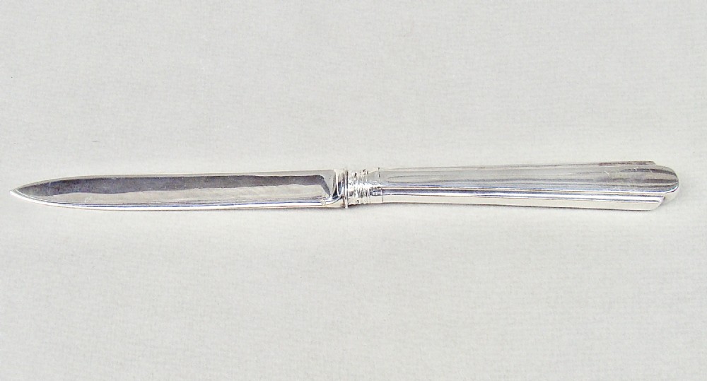 This is a beautiful solid silver and guilloche enamel letter opener or paper knife. The silver handle with an elegant guilloche enamel inset. The back plain. Mounted with a reeded ferrule and a fully hallmarked engraved solid silver blade. It is eye-catching and very elegant. Hallmarks: RM over EH for Richard Martin & Ebenezer Hall. (Martin Hall & Co) Sheffield Assay mark. Lion Passant. Date letters "g" for 1900 Condition: Very good. Dimensions: Length: 26cm / 10 inches. Maximum width: 2cm / 0.5 inches. Postage PLEASE DO NOT FORGET TO ADD POSTAGE AT CHECKOUT. Postage UK: £5 Royal Mail Tracked 24. Postage overseas: £18 International Signed For. You can pay by PayPal, bank transfer, cheque, debit or credit card. To pay by PAYPAL please add P&P and click on button below. To pay by credit or debit card over the phone or by cheque, please contact me on 01449 760 585. Internal Ref: OCT92