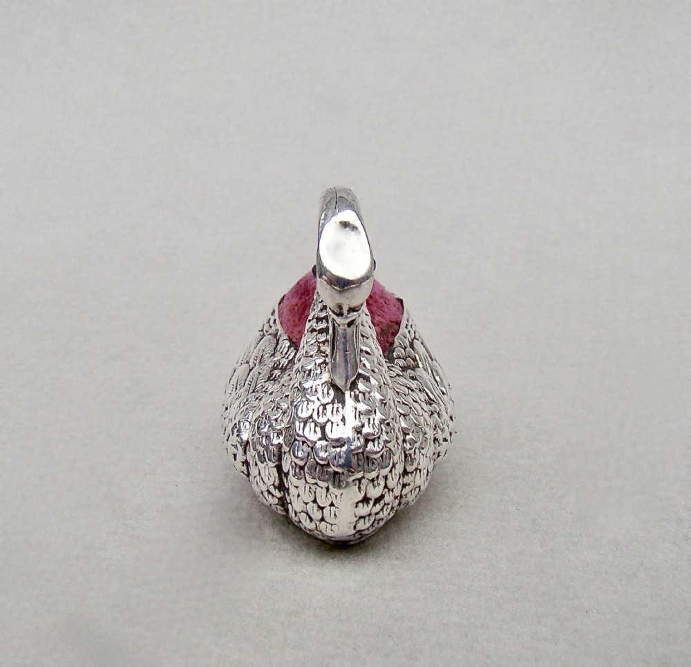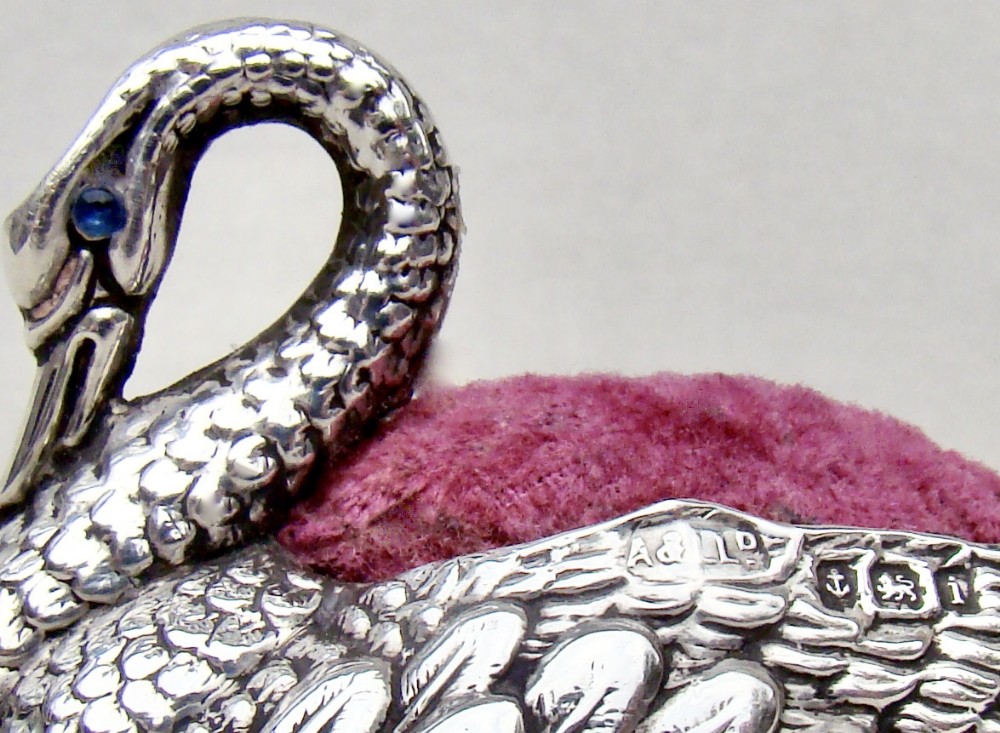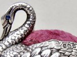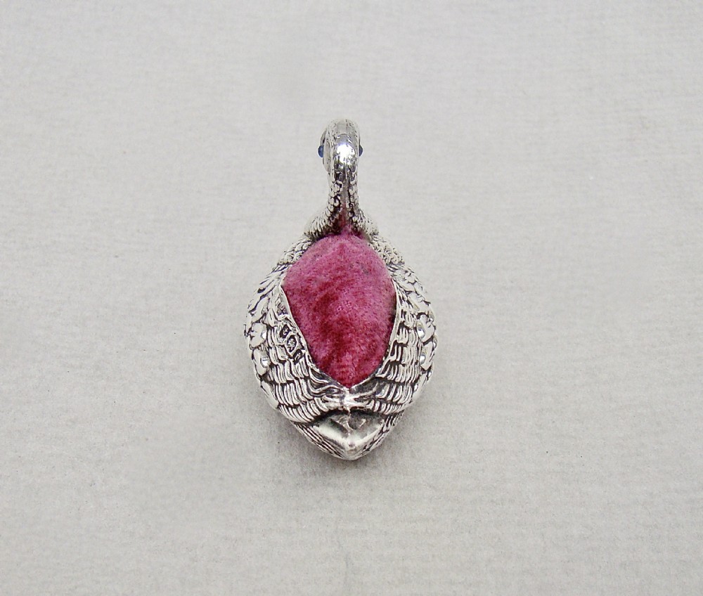This delightful Edwardian silver swan pin cushion bears the marks of Adie & Lovekin and is dated Birmingham 1908. The body with detailed plumage rests on an oval silver base. The eyes inset with blue glass stones, a rare and exquisite detail. The original cushion finished in pink velvet. Hallmarks: AL&L for Adie & Lovekin. Birmingham Assay Mark. Lion Passant. Date letter "i" for 1908. Condition: Good. Very clear hallmarks. Cushion in good condition. Main body in excellent condition. Top of the swan's head with dent, reflected in the p[rice. Dimensions: Length: 6cm / 2.2 inches. Height: 4cm / 1.4 inches. Width: 2.5cm / 1 inches. Postage: PLEASE DO NOT FORGET TO ADD POSTAGE AT CHECKOUT. Postage UK: £9 Special Delivery Next day. Postage overseas: £17 International Signed For. You can pay by PayPal, bank transfer, cheque, debit or credit card. To pay by PAYPAL please add P&P and click on button below. To pay by credit or debit card over the phone or by cheque, please contact me on 01449 760 585 Internal Ref: OCT68
