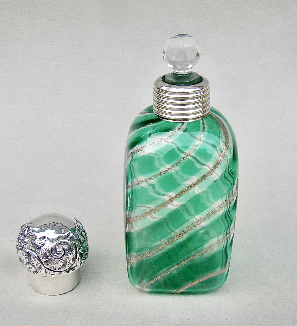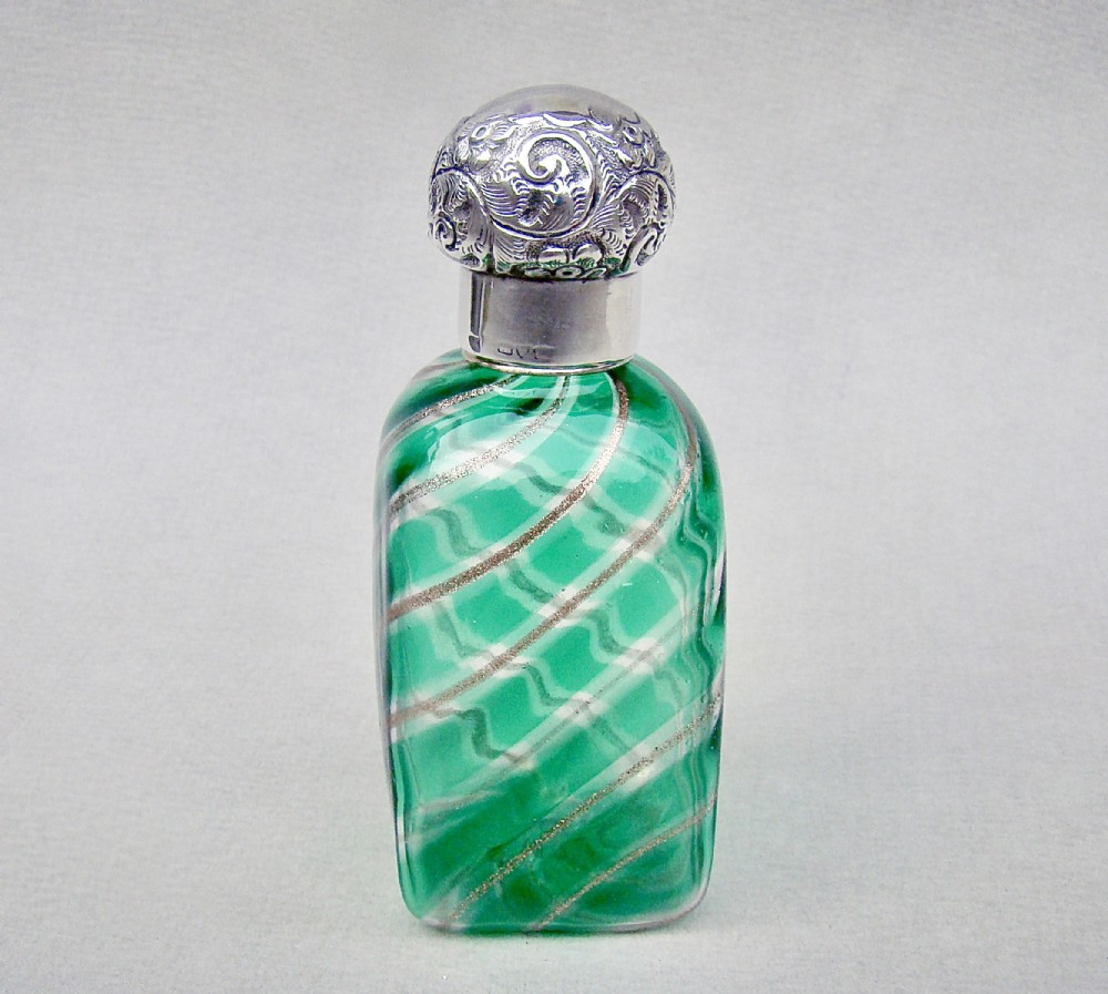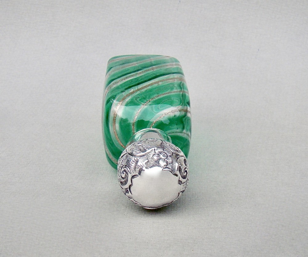 This is an unusual and very pretty Victorian silver mounted Venetian glass scent bottle. The square shaped green glass body decorated with twisted copper trailing. The screw-top silver lid embossed with foliate sprays surrounding a vacant cartouche. Fitted with a clear glass stopper. Hallmarks: Chester Hallmarks. Lion passant. date letter and maker's marks erased. Dimensions: Height: 11cm / 4.3 inches. Width: 4.5cm / 1.6 inches. Depth: 4.5cm / 1.6 inches. Condition: Good. Glass in the inner neck in good condition, no cracks. No holes to the lid. Hallmarks partially erased. Postage: PLEASE DO NOT FORGET TO ADD POSTAGE AT CHECKOUT. Postage UK: £5 Royal Mail Tracked 24 Postage overseas: £20 International Signed For. You can pay by PayPal, bank transfer, cheque, debit or credit card. To pay by PAYPAL please add P&P and click on button below. To pay by credit or debit card over the phone or by cheque, please contact me on 01449 760 585. Internal Ref: NOVE92