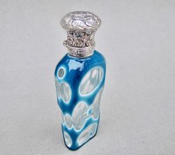 This delightful Victorian silver mounted enamelled green glass scent bottle bears the marks of John Grinsell and is dated Birmingham 1900. The slightly panelled pale green glass body heightened with sprays of enamel flowers. Fitted with a fully hallmarked embossed silver screw-top lid. The lid decorated with flowers surrounding a vacant cartouche. The neck with clear glass stopper.