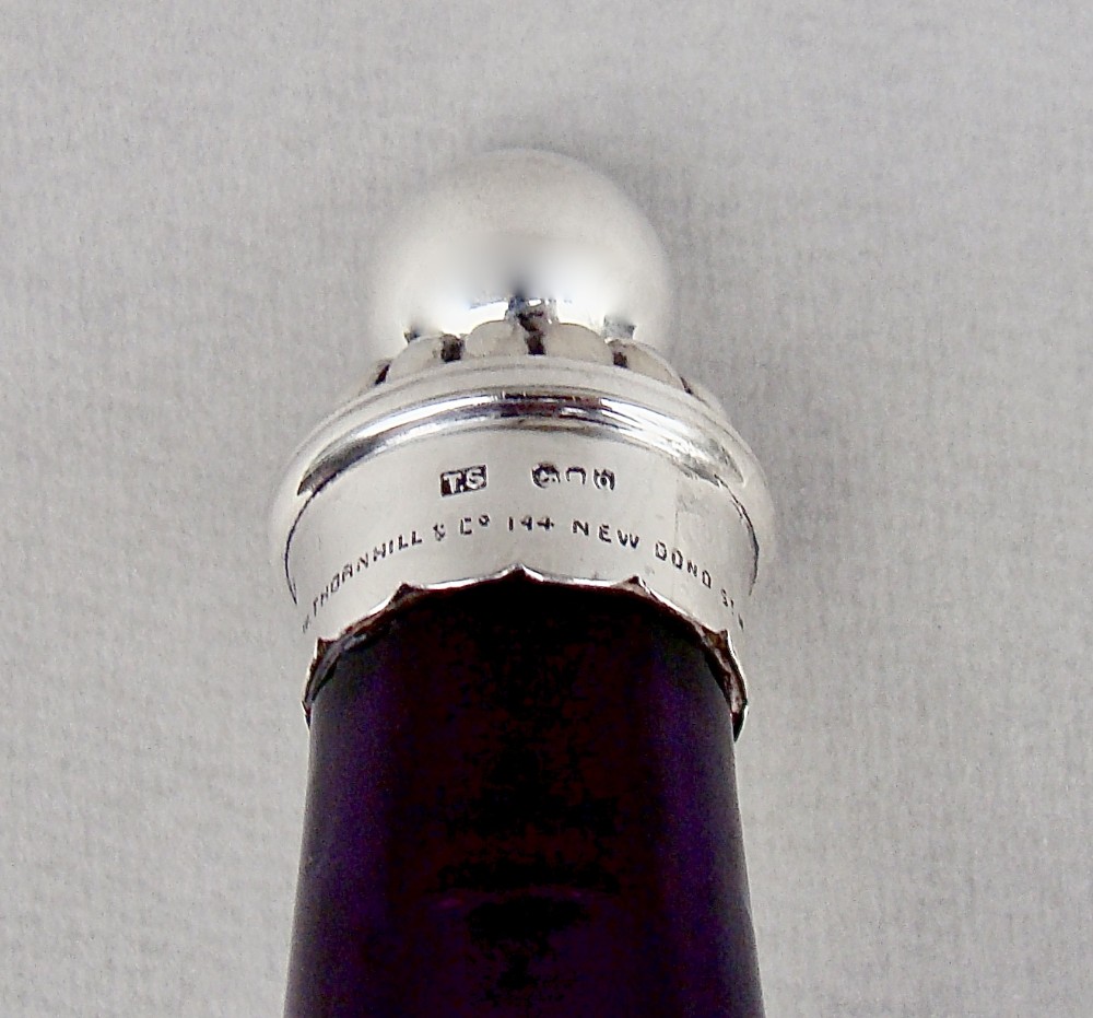 This fabulous Victorian silver mounted glass decanter comes in the most stunning and sought-after amethyst colour. The simple and elegant glass body mounted with a scalloped silver collar and matching ball stopper. As well as bearing a full set of hallmarks, it is Impressed with the renowned retailer's marks of W Thornhill & Co, 144 New Bond Street. Hallmarks: TS for Thomas Stapleton London Assay Mark. Lion Passant. Date letter "O" for 1899. Dimensions: Height: 34cm / 14 inches. Base diameter: 7cm / 2.6 inches. Condition: Excellent. No chips, no cracks, no cloudiness. Silver neck in good condition. Postage: Postage UK: £15 Special delivery Postage overseas: £45 International courier. You can pay by PayPal, bank transfer, cheque, debit or credit card. To pay by PAYPAL please add P&P and click on button below. To pay by credit or debit card over the phone or by cheque, please contact me on 01449 760 585. Internal Ref: NOVE84