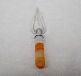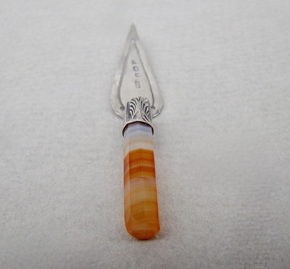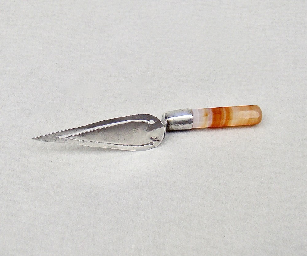 DELIGHTFUL GEORGE V SILVER AND BANDED AGATE TROWEL BOOKMARK BY WILLIAM HENRY LEATHER, BIRMINGHAM 1915