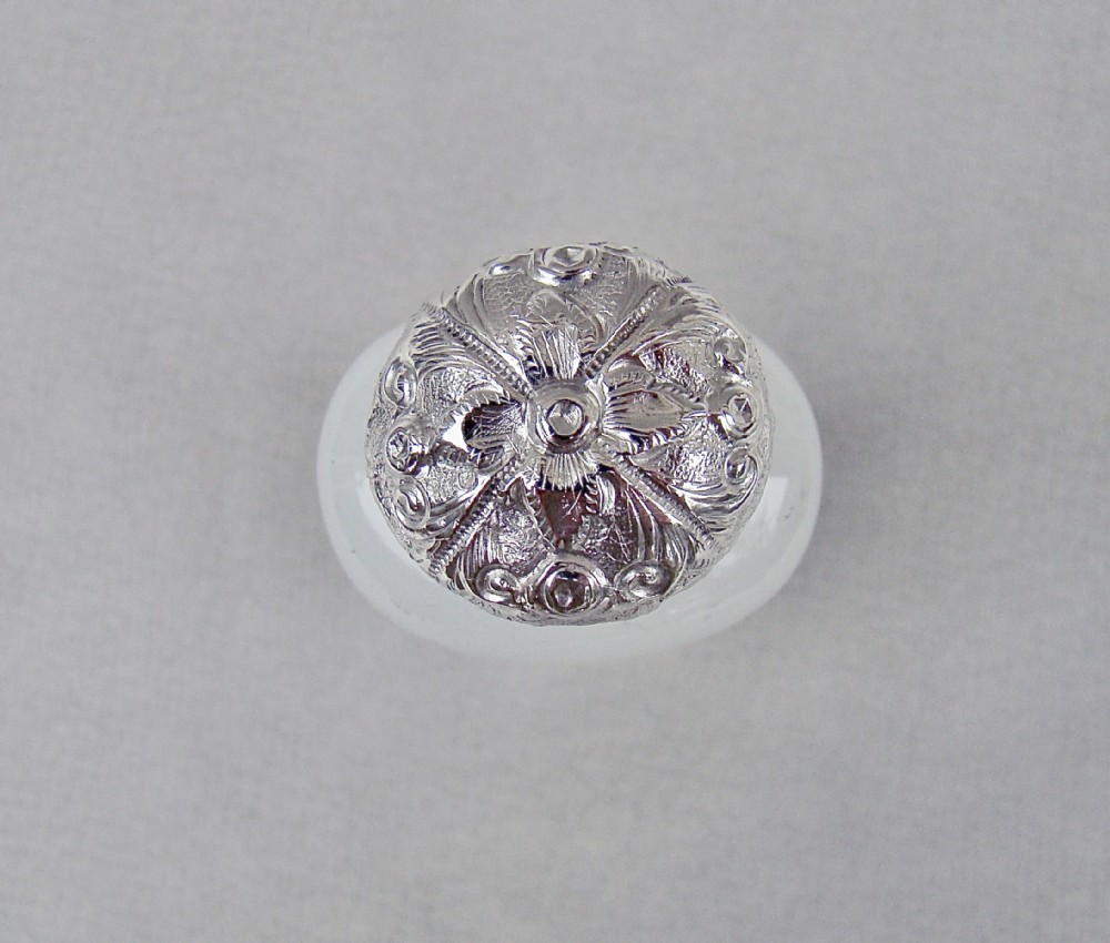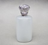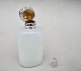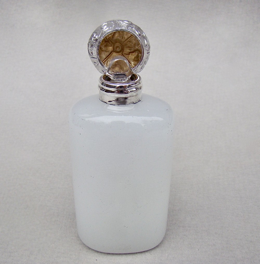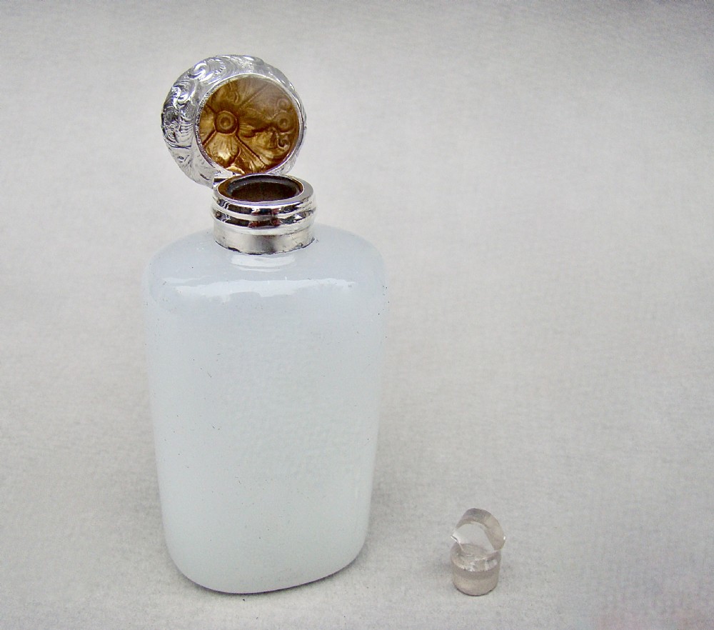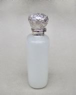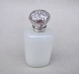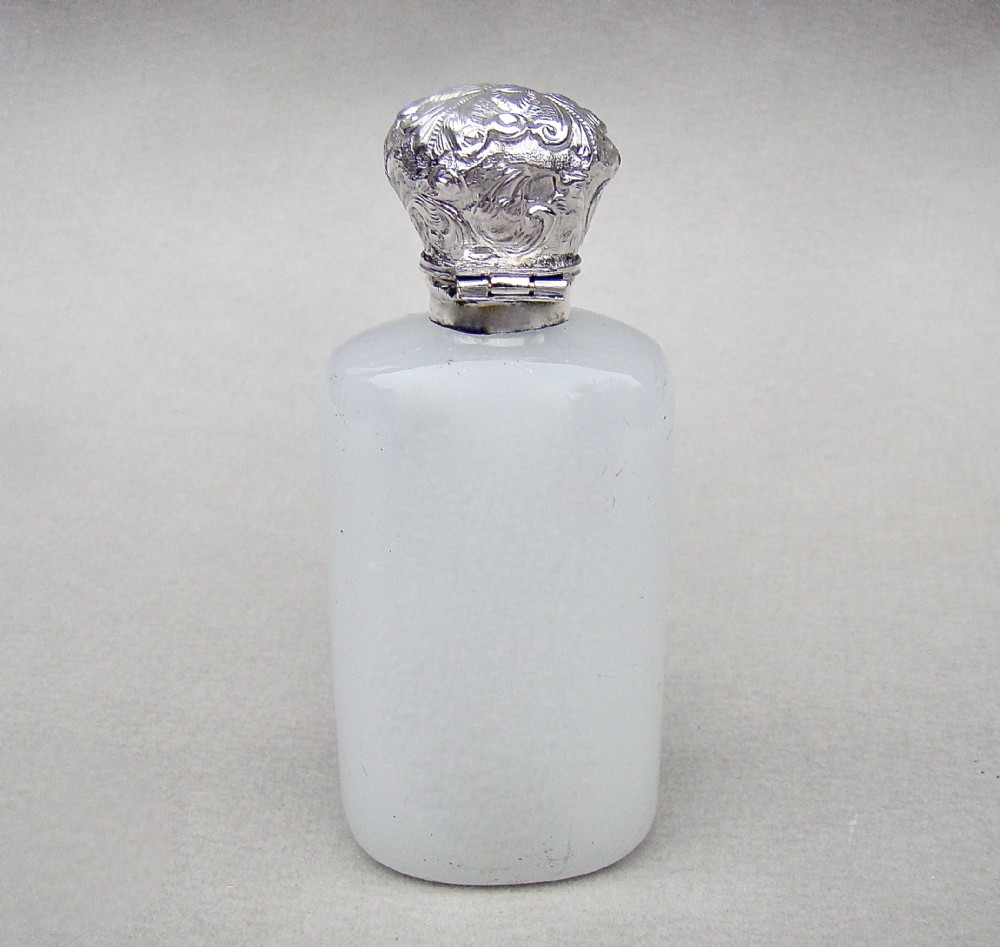 This is a very tactile silver and opaline glass scent bottle. The opalescent white body of rounded rectangular form. The neck mounted with a beautiful embossed silver lid. The inner lid slightly gilt adn the neck fitted with the original glass stopper.