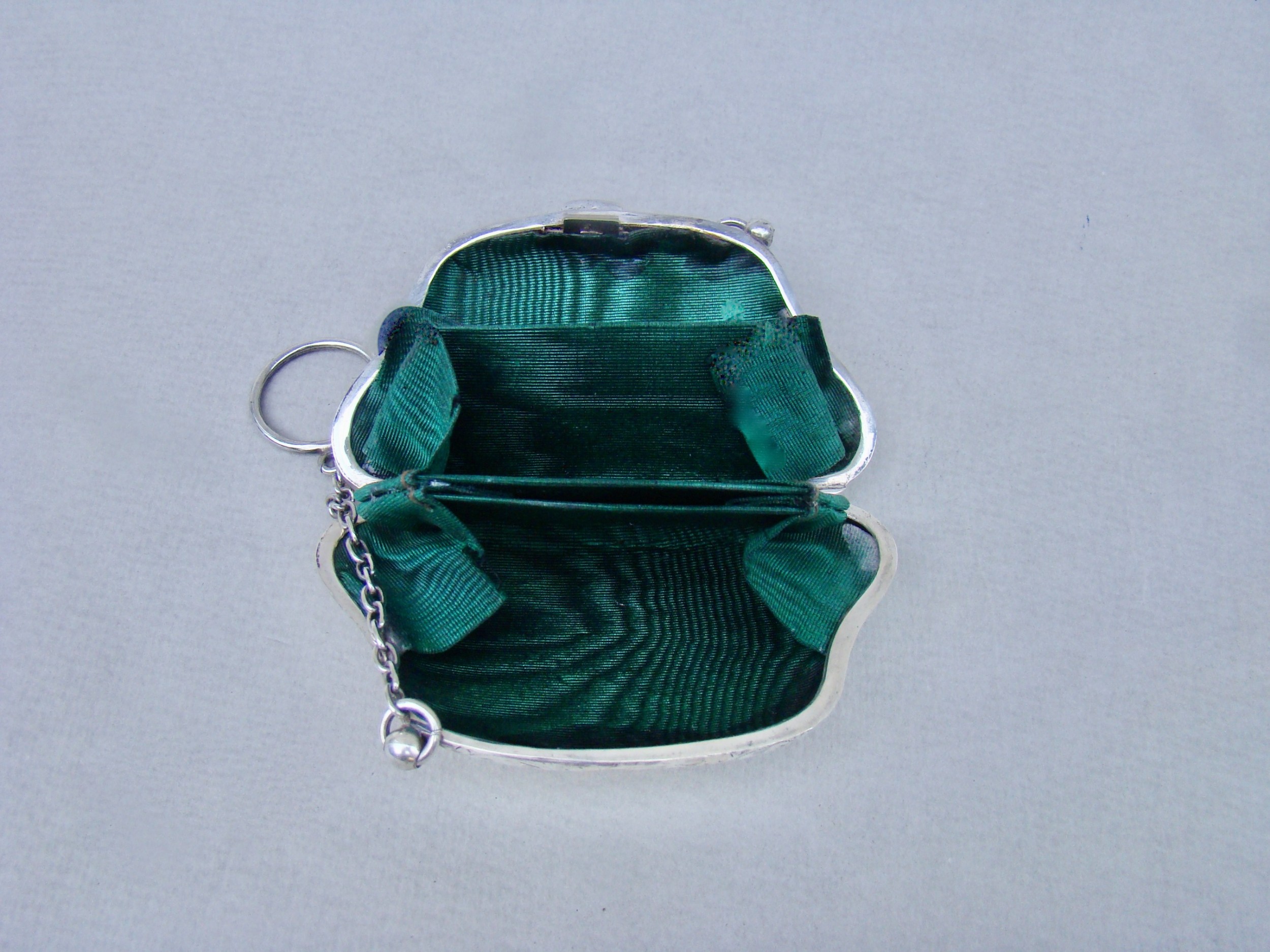 This very pretty George V sterling silver purse was made by the prolific Samuel Levi and is dated Birmingham 1910. Of conventional form, both sides engraved with foliate scrolls. The front with a vacant cartouche. The push button opening to reveal the original green moire silk compartmentalised interior. The sides fitted with a chain and suspension ring to allow a lady to hold her purse while holding her cocktail glass. Hallmarks: S.M. L for Samuel Levi. Birmingham Assay Mark. Lion Passant. Date letter "l" for 191-. Dimensions: Width: 9cm / 3.4 inches. Height (excluding chain): 5.5cm / 2 inches. Condition: Good throughout. A few minor dingd commensurate with age and use. Good original interior. Delivery: PLEASE DO NOT FORGET TO ADD POSTAGE AT CHECKOUT. Postage UK: £5 Royal Mail Tracked 24. Postage overseas: £20 International Signed For. Postage USA (including US import duties): £45.00 You can pay by PayPal, bank transfer, cheque, debit or credit card. To pay by PAYPAL please add P&P and click on button below. To pay by credit or debit card over the phone or by cheque, please contact me on 01449 760 585. Internal Ref: DEC96