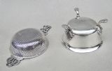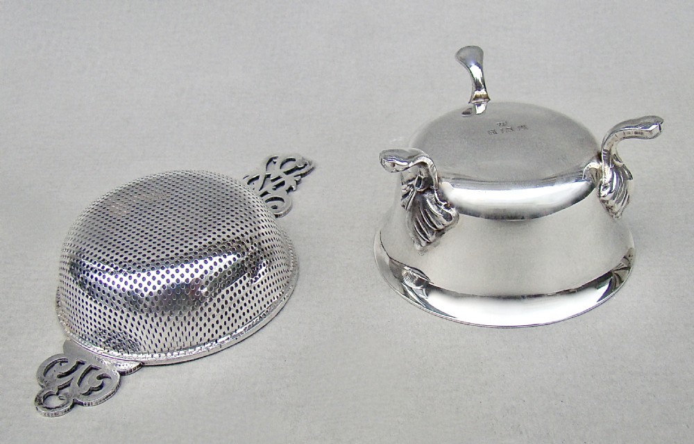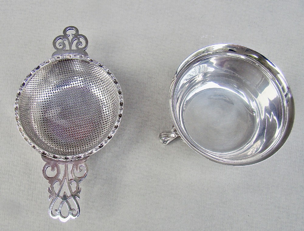 FABULOUS MID-CENTURY SILVER TEA STRAINER & STAND BY CHATTERLEY & SON, BIRMINGHAM 1966