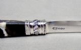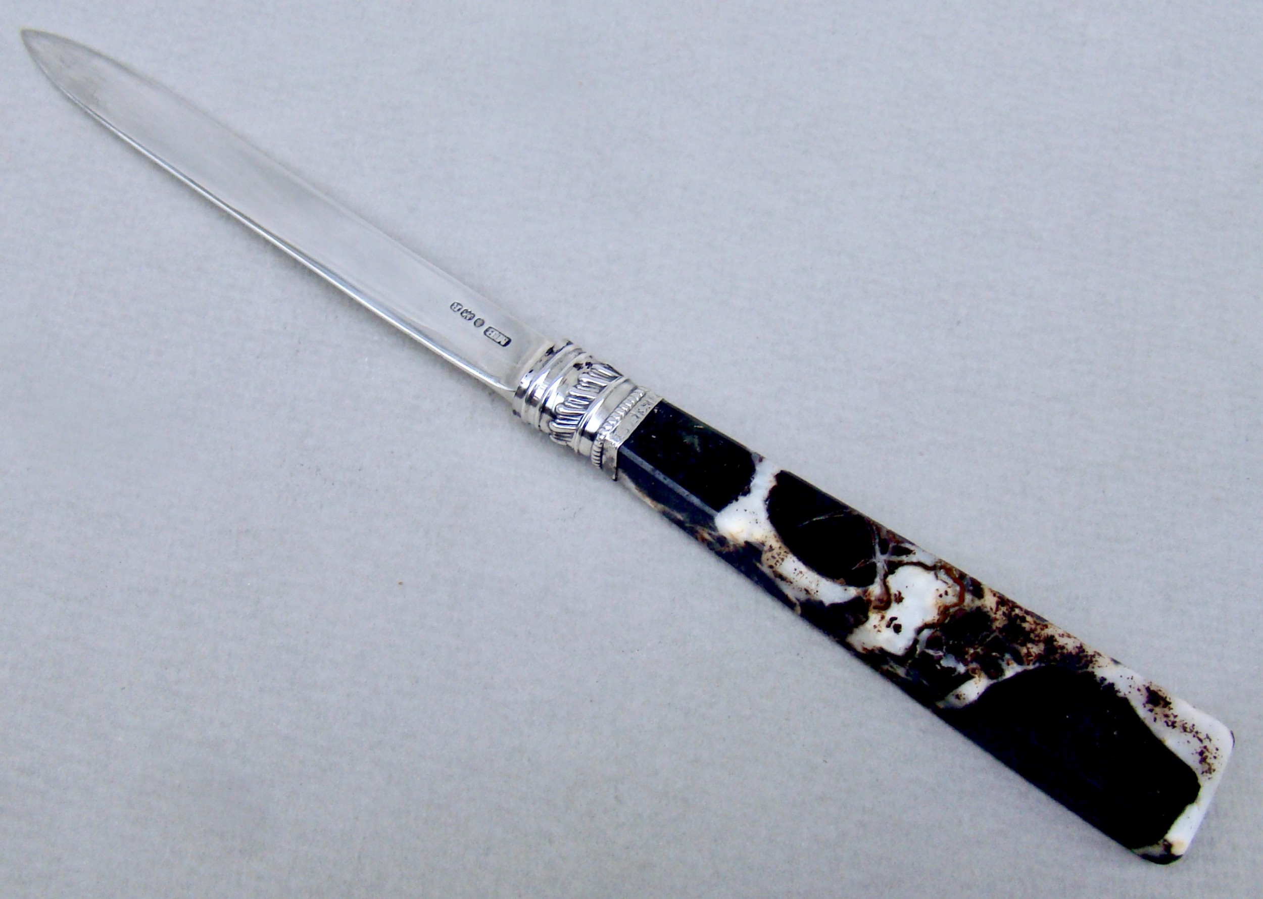 This stunning solid silver and polished agate letter opener or paper knife was made by Moses Brent and dated London 1812. The agate handle an unusual brown and cream marbled colour. Mounted with a decorative silver ferrule and hallmarked solid silver blade . It combines elegance with practicality. Hallmarks: MB fot Moses Brent. London Assay mark. Lion Passant. Date letters "R" for 1812. Condition: Very good. Dimensions: Length: 21.5cm / 8.4 inches. Maximum width: 2cm / 0.6 inch. Postage: PLEASE DO NOT FORGET TO ADD POSTAGE AT CHECKOUT. Postage UK: £5 Royal Mail Tracked 24 Postage overseas: £18 International Signed For. You can pay by PayPal, bank transfer, cheque, debit or credit card. To pay by PAYPAL please add P&P and click on button below. To pay by credit or debit card over the phone or by cheque, please contact me on 01449 760 585. each with polished agate handles Internal Ref: DEC88