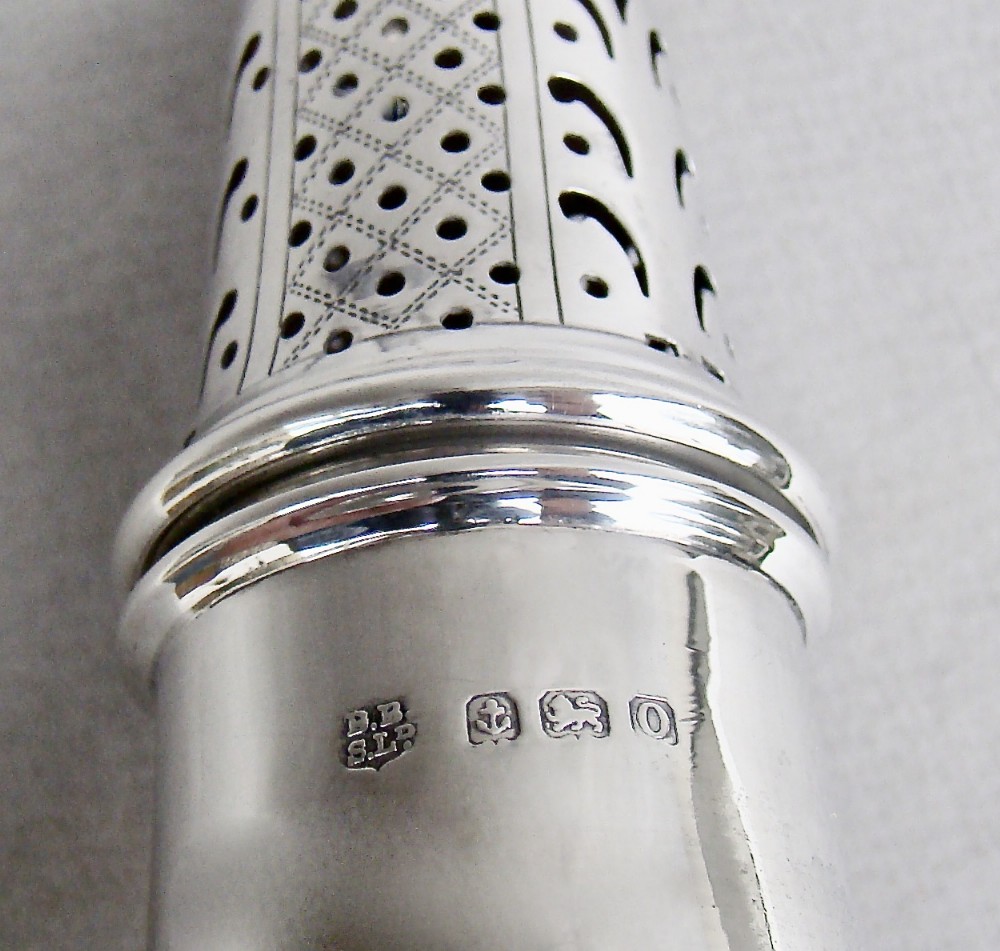 This very elegant George VI silver vase-shaped sugar caster is dated Birmingham 1938 and bears the marks of the Barker Brothers. Modelled on early George II casters (circa 1730) the baluster body with a detachable pierced cover. The cover with baluster finial and alternating vertical bands of decorative piercing. Raised on a circular pedestal base. Hallmarks: Fully marked on the body. Partial marks on the inner lid. BB S LD for the Barker Brothers. Birmingham Assay Mark. Lion Passant. Date letter "O" for 1938. Dimensions: Height: 17cm / 6.3 inches. Diameter: 6cm / 2.2 inches. Weight: 93 g / 3.2 oz. Condition: Very good. No dents. Stable on its base. Postage: PLEASE DO NOT FORGET TO ADD POSTAGE AT CHECKOUT. Postage UK: £5 Royal Mail Tracked 24. Postage overseas: £20 International Signed For. Postage USA (including US import duties): £45.00 You can pay by PayPal, bank transfer, cheque, debit or credit card. To pay by PAYPAL please add P&P and click on button below. To pay by credit or debit card over the phone or by cheque, please contact me on 01449 760 585. Internal Ref: JANV95