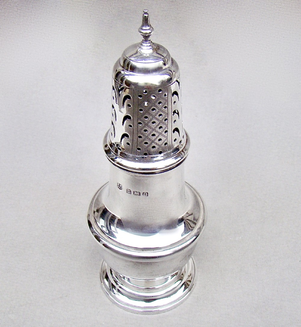 GEORGIAN REVIVAL SOLID SILVER SUGAR CASTER BY THE BARKER BROTHERS, BIRMINGHAM 1938