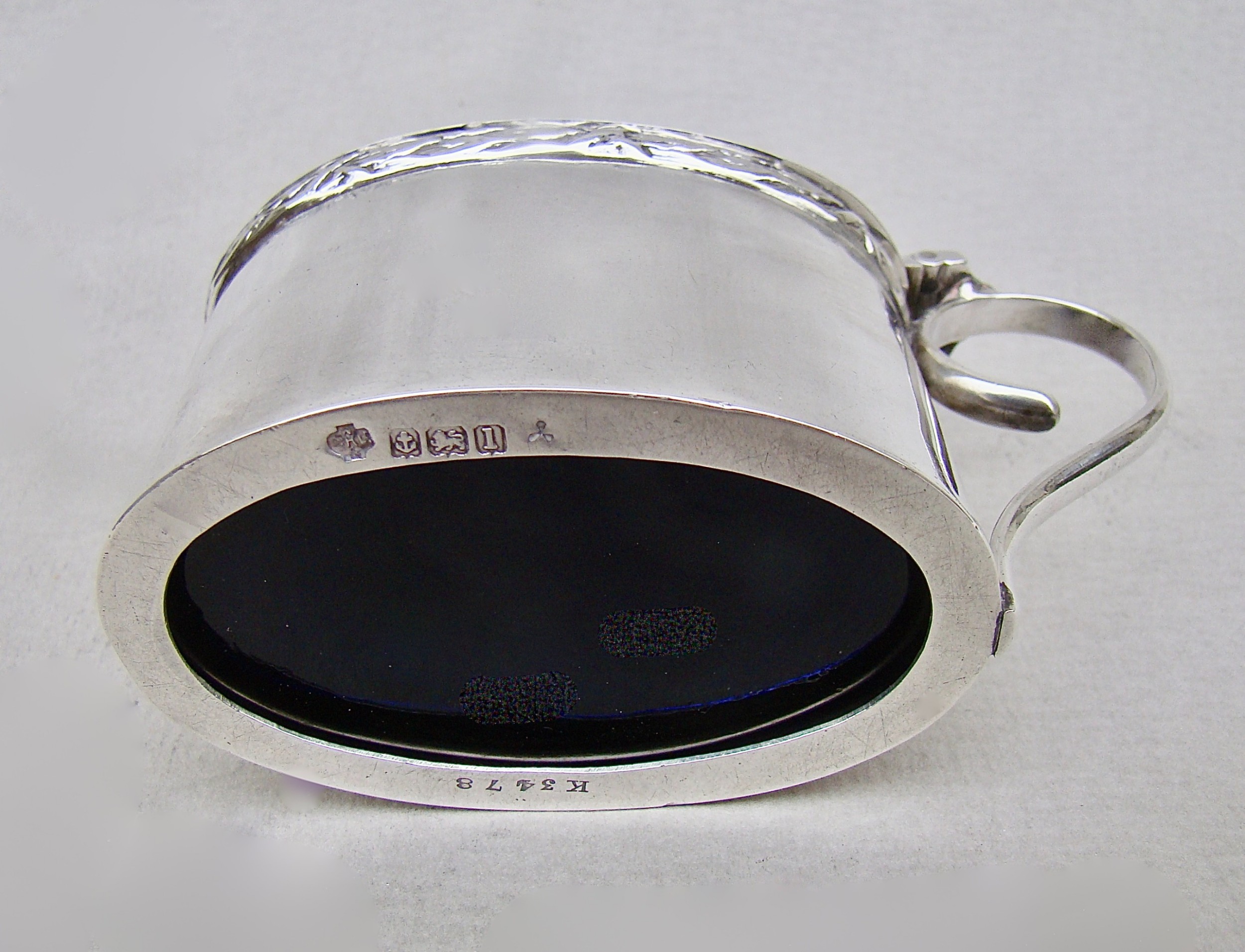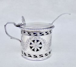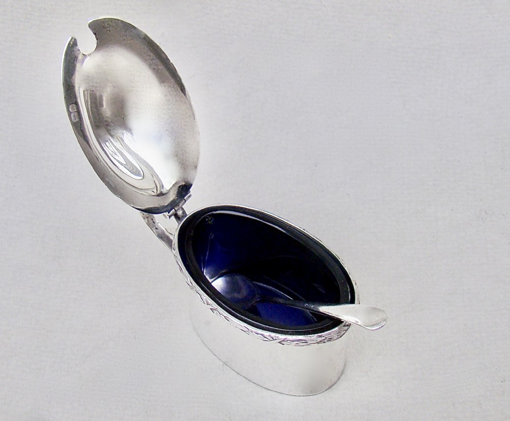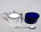 This very elegant sterling silver mustard pot is dated Birmingham 1910 and was made by the sought-after silversmith William Hutton. Of traditional oval form , the plain sides with a distinctive rope-twist border, giving it an Arts & Craft look. The domed cover with urn shaped finial. The back with elegant scroll handle. Fitted with the original blue glass liner and sold with a very well matched sterling silver mustard spoon by John Round, dated Sheffield 1909. Hallmarks: WH&S LD for William Hutton & Sons. Birmingham Assay Mark. Lion Passant. Date letters "l" for 1910. Condition: Very good No dings or dents. Liner in perfect condition. Good hinge. Dimensions and Weight: Height up to handle: 5.5cm / 2.2 inches. Length: 10cm / 4 inches Width: 4.5cm / 2 inches Weight excluding liner: 91 g / 3.2 oz. Postage: PLEASE DO NOT FORGET TO ADD POSTAGE AT CHECKOUT. Postage UK: £5 Royal Mail Tracked 24. Postage overseas: £20 International Signed For. Postage USA (including US import duties): £45.00 You can pay by PayPal, bank transfer, cheque, debit or credit card. To pay by PAYPAL please add P&P and click on button below. To pay by credit or debit card over the phone or by cheque, please contact me on 01449 760 585. Internal Ref: JANV94