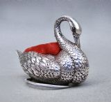 This delightful and very unusual Edwardian silver swan pin cushion bears the marks of Adie & Lovekin and is dated Birmingham 1908. The body with detailed plumage rests on a circular silver ring. The eyes inset with ruby stones, a rare and exquisite detail. The original cushion finished in red velvet. The underside with black Morocco leather. Hallmarks: AL&L for Adie & Lovekin. Birmingham Assay Mark. Lion Passant. Date letter "i" for 1908. Condition: Very good. Body in excellent condition. Dimensions: Length: 7.5cm / 3 inches. Height: 4.5cm / 1.6 inches. Width: 4cm / 1.4 inches. PLEASE DO NOT FORGET TO ADD POSTAGE AT CHECKOUT. Postage UK: £5 Royal Mail Tracked 24. Postage overseas: £20 International Signed For. Postage USA (including US import duties): £45.00 You can pay by PayPal, bank transfer, cheque, debit or credit card. To pay by PAYPAL please add P&P and click on button below. To pay by credit or debit card over the phone or by cheque, please contact me on 01449 760 585. Internal Ref: JANV87