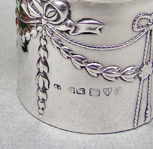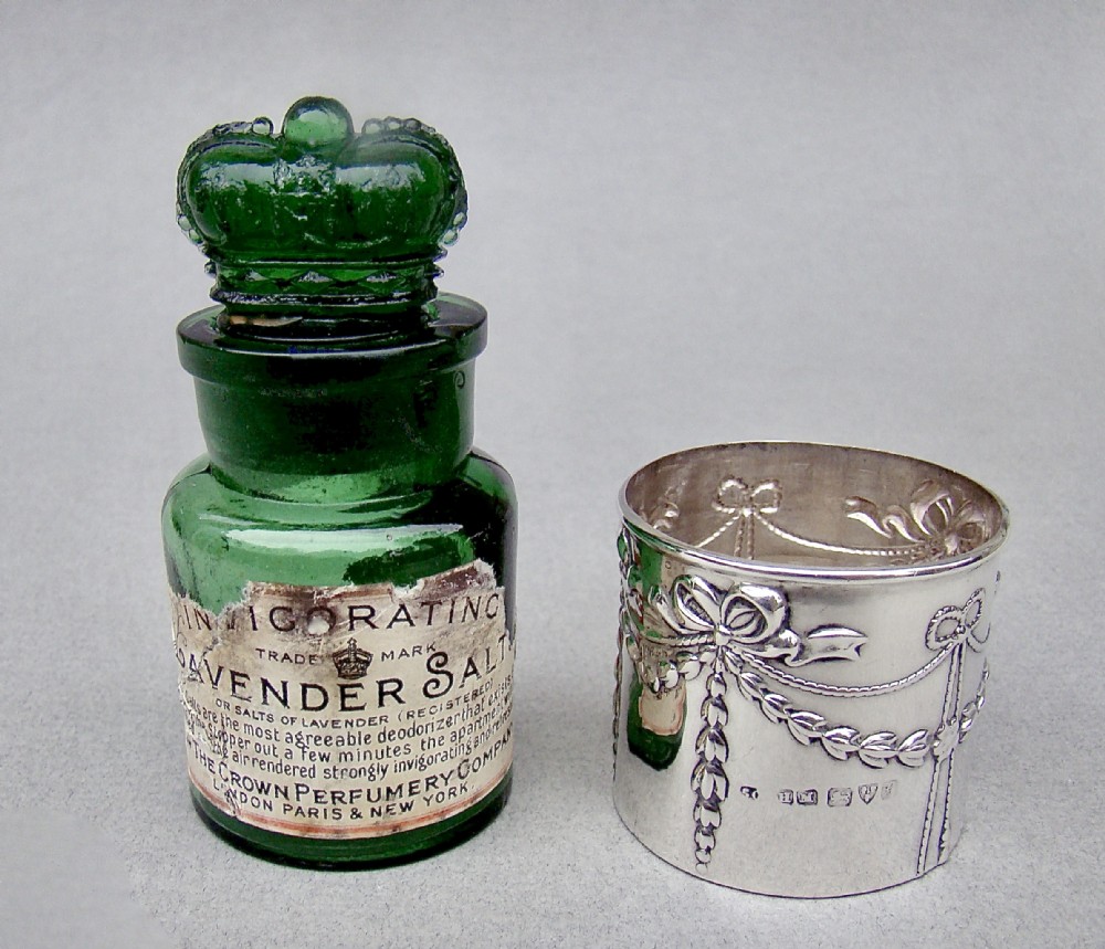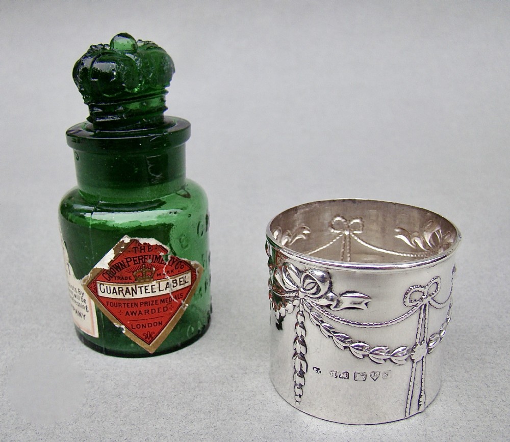 This is an rareand rather gorgeous Edwardian silver "Lavender Salts " glass scent bottle by the Crown perfumery Company, London. The embossed silver sleeve by the renowned silversmith Henry Matthews is dated Chester 1907. Of cylindrcail for, the lid in the shape of the crown. The silver sleeve embossed with classical ribbon-tied swags. Hallmarks: HM for Henry Matthews. Chester Assay Mark. Lion Passant. Date letter "G" for 1907. Dimensions: Height: 8cm / 3 inches. Diameter: 4.5cm / 1.4 inches. Condition: Very good. PLEASE DO NOT FORGET TO ADD POSTAGE AT CHECKOUT. Postage UK: £5 Royal Mail Tracked 24. Postage overseas: £20 International Signed For. Postage USA (including US import duties): £45.00 You can pay by PayPal, bank transfer, cheque, debit or credit card. To pay by PAYPAL please add P&P and click on button below. To pay by credit or debit card over the phone or by cheque, please contact me on 01449 760 585. Internal Ref: JANV84