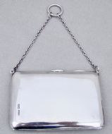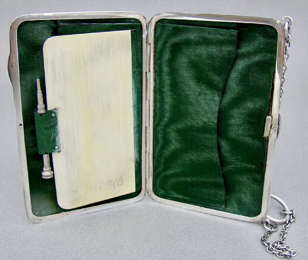 This simple and elegant silver aide memoire is dated Chester 1912 and was made by the renowned Sampson Mordan & Co. Of rounded rectangular form, the plain front with chain attachment and finger ring. The interior lined with the original green moire silk including an ivory coloured notepad and a silver propelling pencil with agate terminal. The back plain and fully hallmarked.