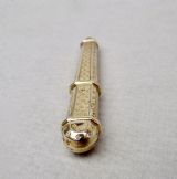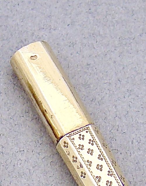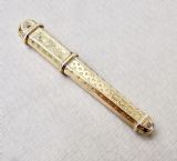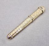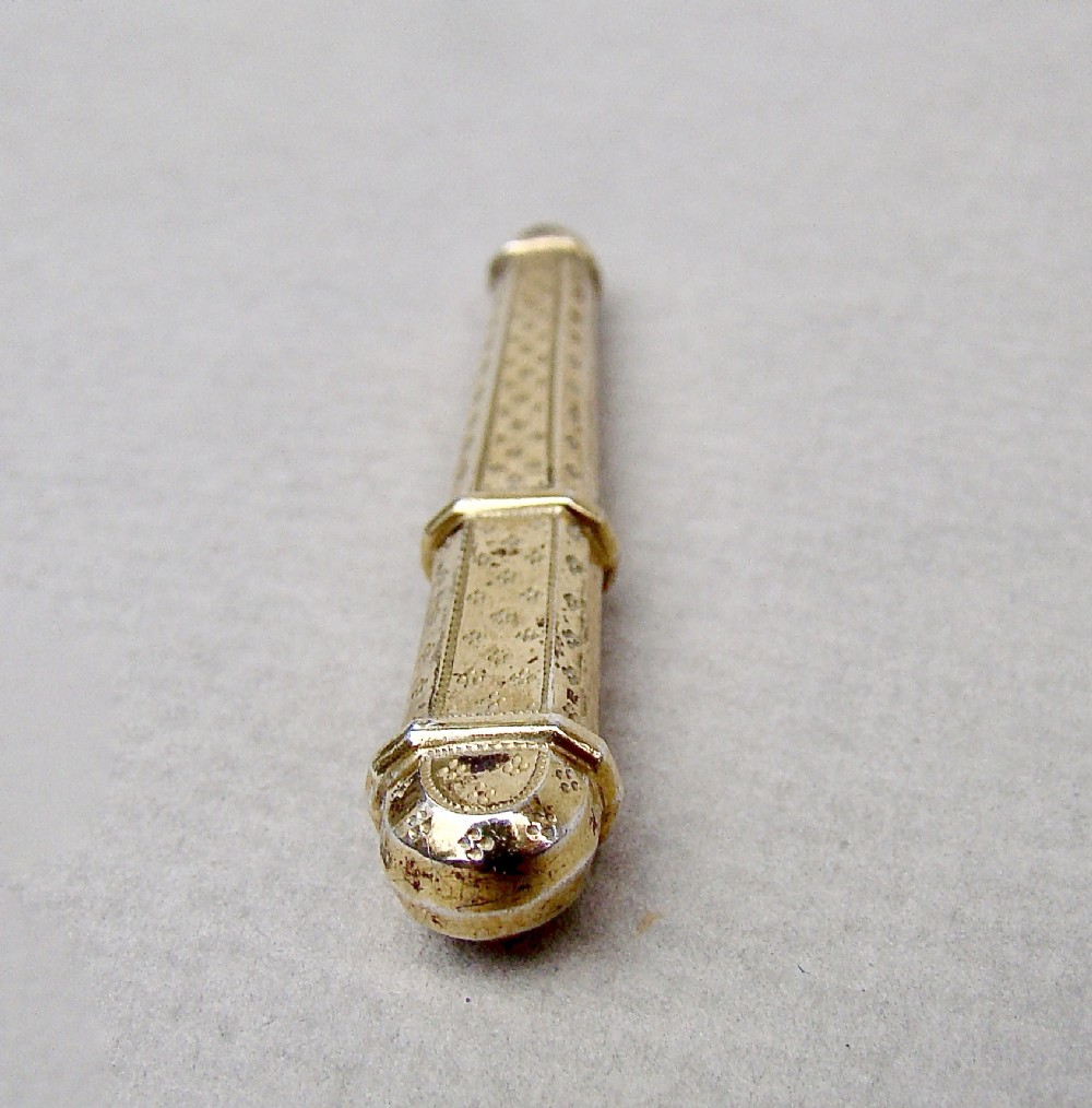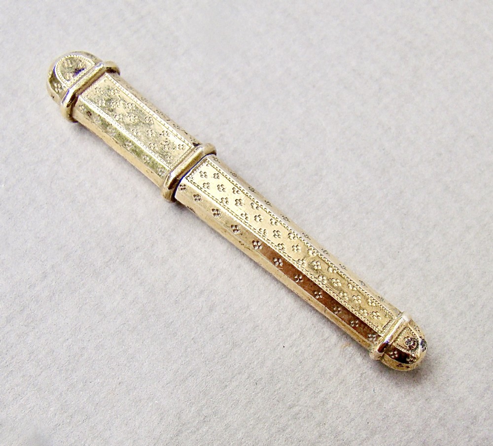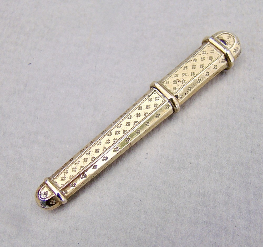 This silver gilt needle case is very much in the French classical taste. The elegant tapered body engraved on both sides on both sides with prick-dot motifs. the pull-off cover with conforming decorations.