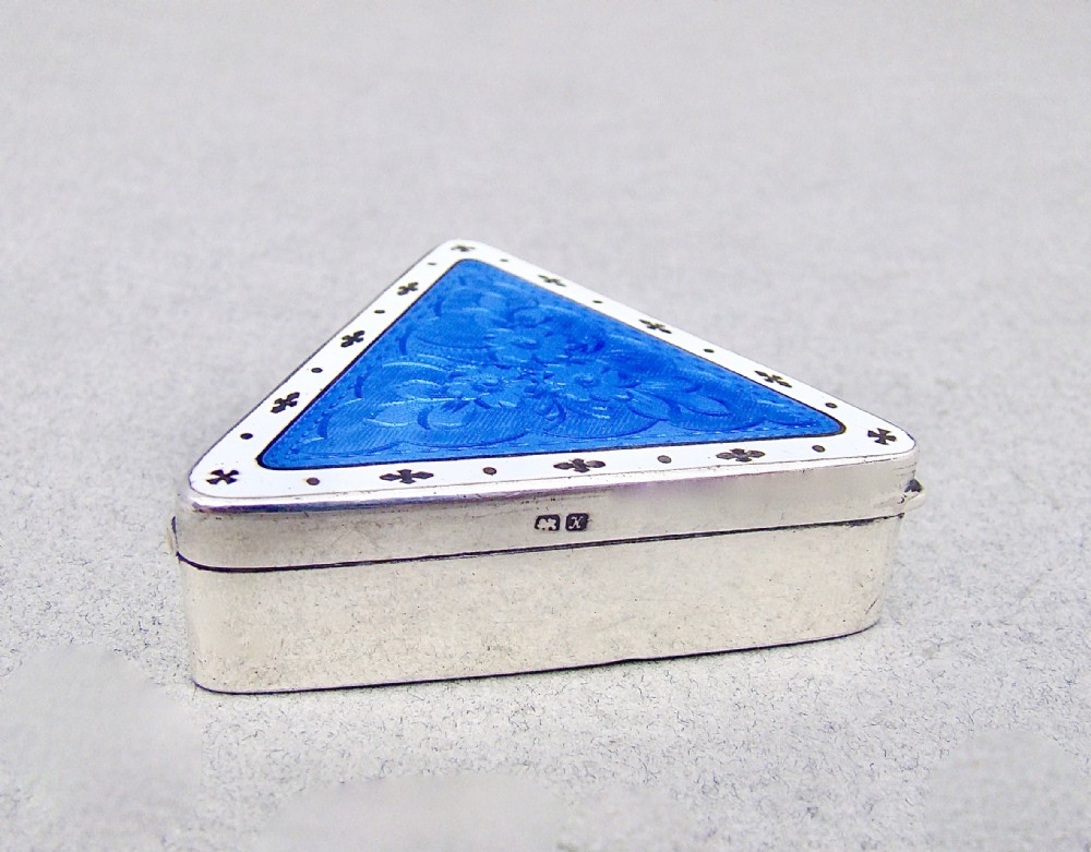 This rare silver and dual colour guilloche enamel pill box was made by Cohen & Charles and is dated Chester 1910. Of unusual triangular form, the delicately engraved guilloche enamel lid a vibrant blue colour surrounded by an elegant silver rimmed white border inset with silver motifs. Plain silver sides and base. Gilt inner lid and interior.