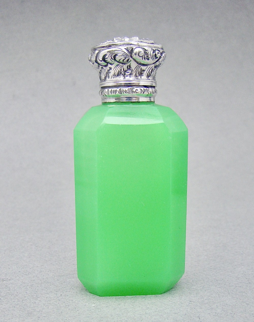 STUNNING VICTORIAN SILVER MOUNTED OPALINE URANIUM GLASS SCENT BOTTLE, CIRCA 1880