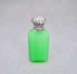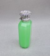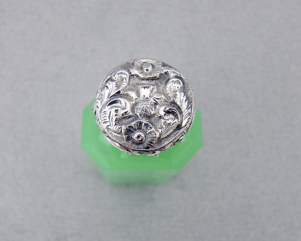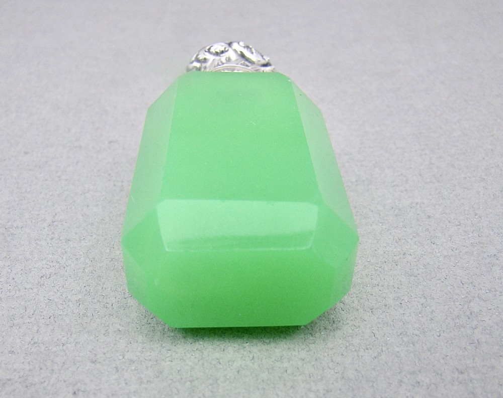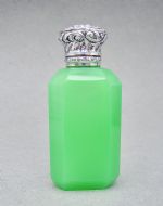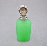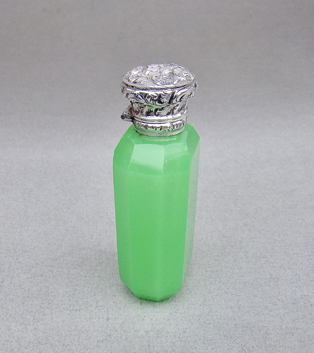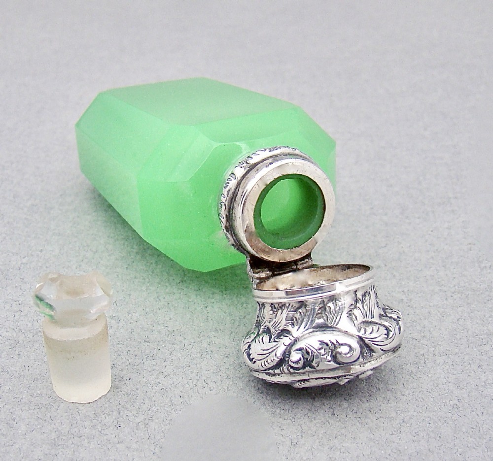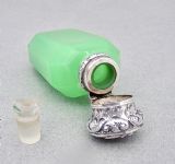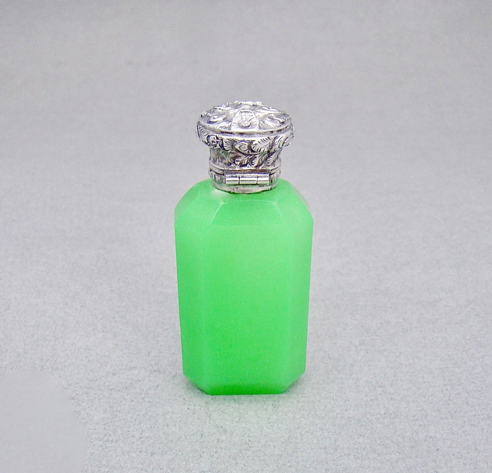 This is an unusual and very striking silver mounted opaline uranium glass scent bottle. The uranium green opaline sliced-cut glass body mounted with a goegeous silver hinged lid embossed with flowers. The neck fitted with a clear glass stopper.