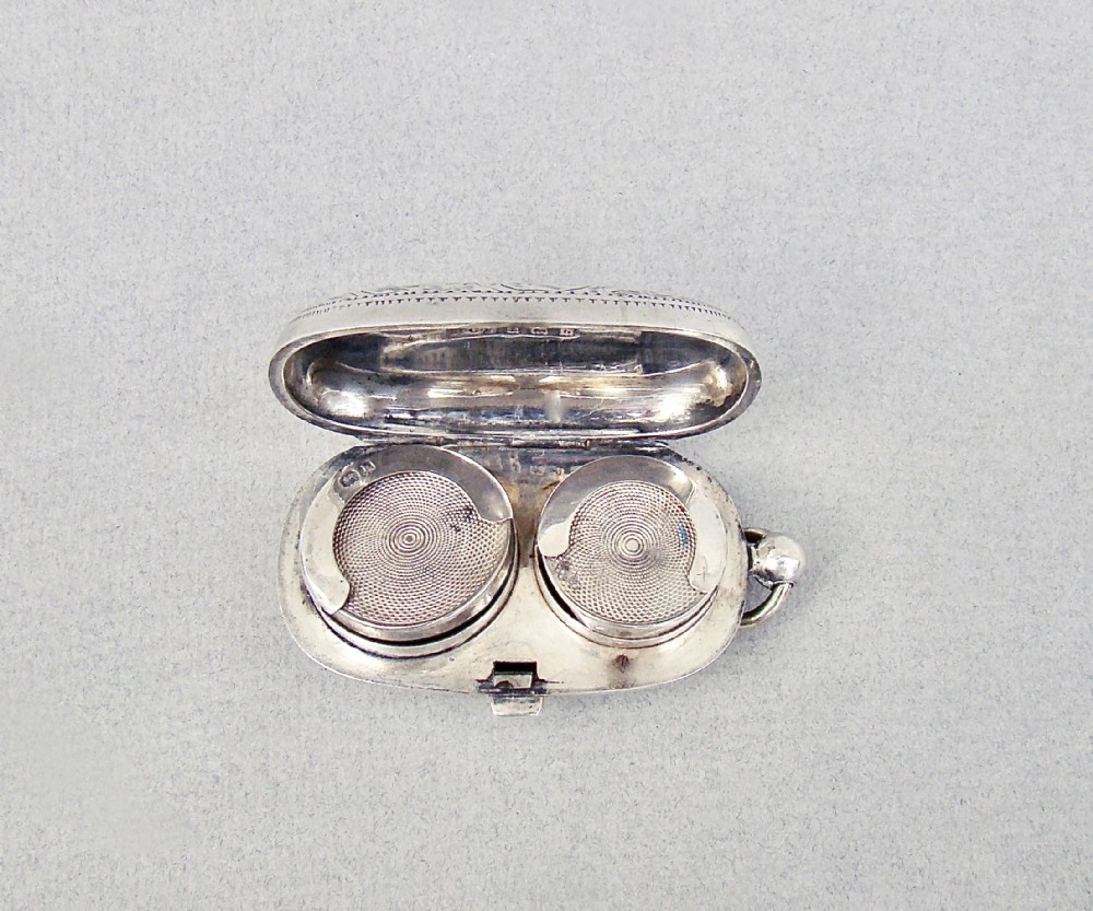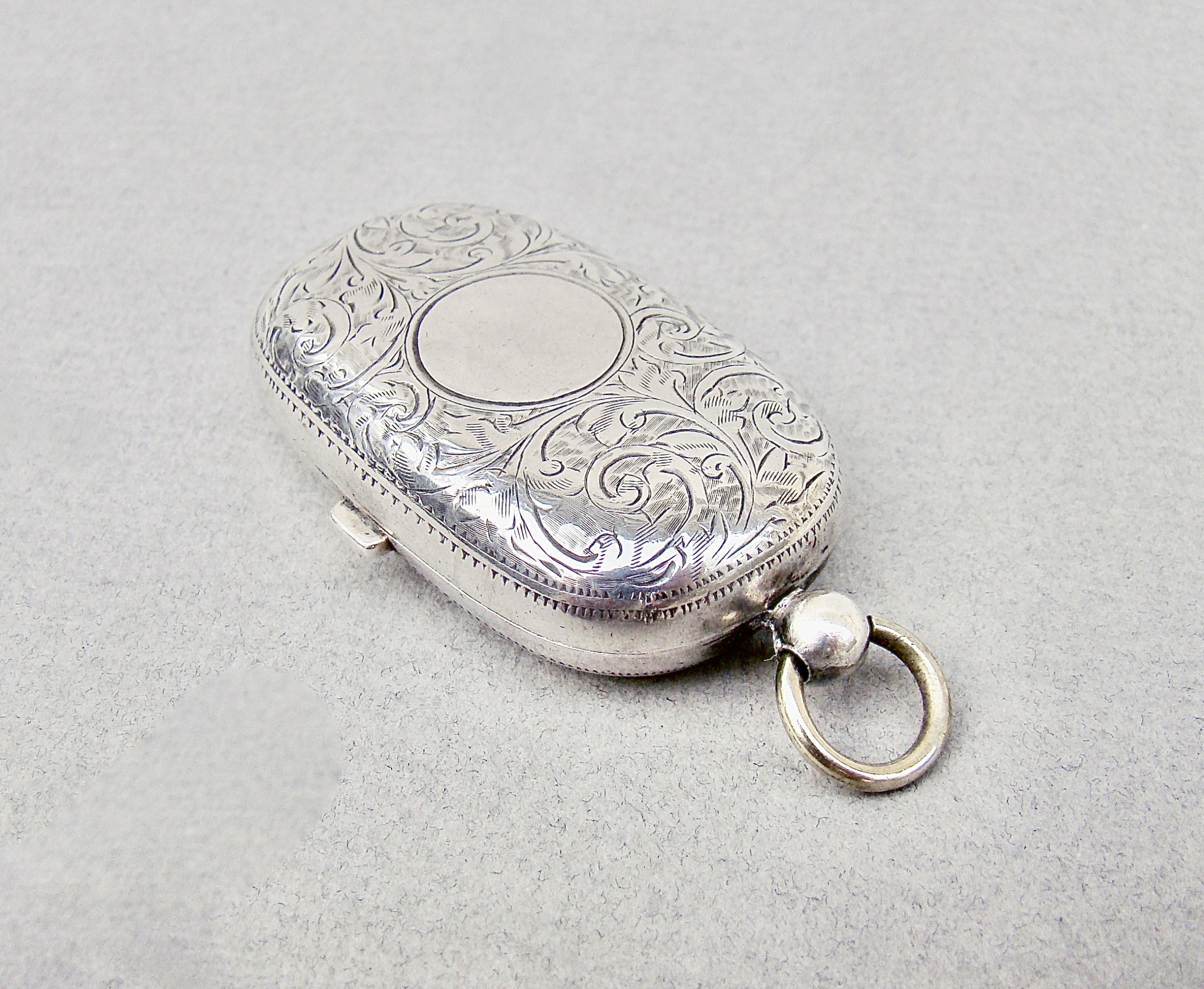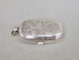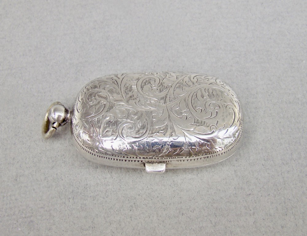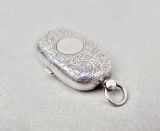 This delightful silver double sovereign case is of rounded rectangular form. The body engraved with foliate scrolls on both sides centred by a circular vacant reserve. It was made in Birmingham in 1907 by Henry Charles Freeman. The sprung hinged cover opening to reveal two spring loaded compartments. Push button clasp. Suspension loop. Snaps shut beautifully.