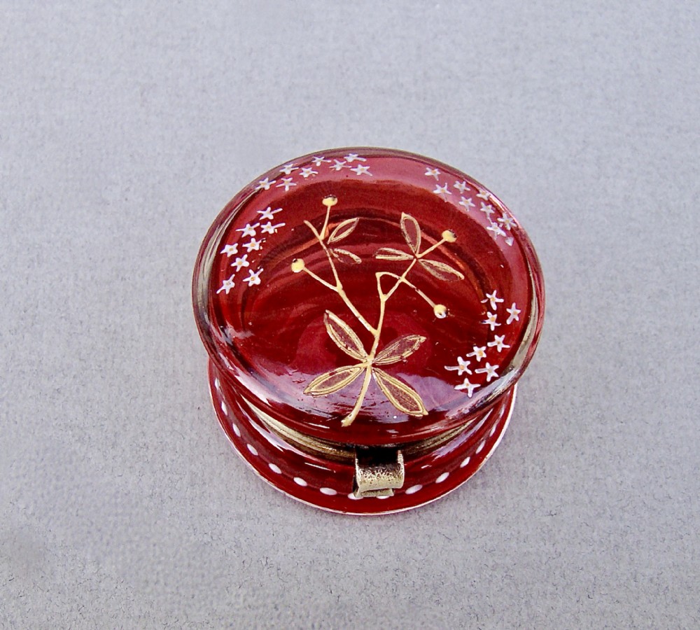 This is a gorgeous trinket box originating from France and dating circa 1890. The brass bound hinged cranberry glass lid beautifully decorated with a gilt and white enamel foliate spray. The sides heightened with white enamel dots. Dimensions: Diameter: 4.5cm / 1.6 inches. Height: 2.5cm / 1 inch. Condition: Very good. No damage to the glass. Gilt decorations in good order. Delivery: PLEASE DO NOT FORGET TO ADD POSTAGE AT CHECKOUT. Postage UK: £5 Royal Mail Tracked 24. Postage overseas: £15 International Signed For. Postage USA (including US import duties): £30.00 You can pay by PayPal, bank transfer, cheque, debit or credit card. To pay by PAYPAL please add P&P and click on button below. To pay by credit or debit card over the phone or by cheque, please contact me on 01449 760 585. Internal Ref: MAR96