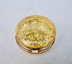 This is a gorgeous trinket box originating from France and dating circa 1890. The brass bound hinged cranberry glass lid beautifully decorated with a gilt and white enamel foliate spray. The sides heightened with white enamel dots.