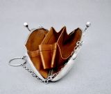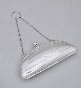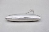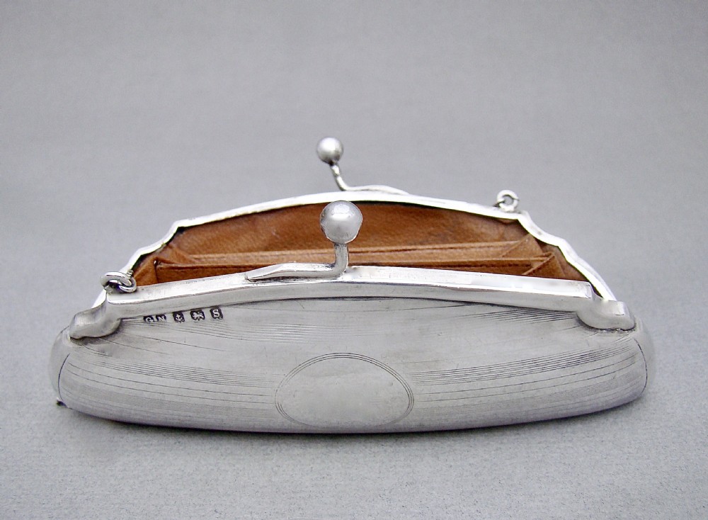 This stylish sterling silver cocktail purse was made in Birmingham in 1917 and bears the marks of G. Norman. The front and back engraved with elegant engine-turned decorations. The front with a vacant roundel. The clasp opening to reveal the original tan leather interior. The sides fitted with a chain and suspension ring to allow a lady to hold her purse while dancing or holding her cocktail glass.