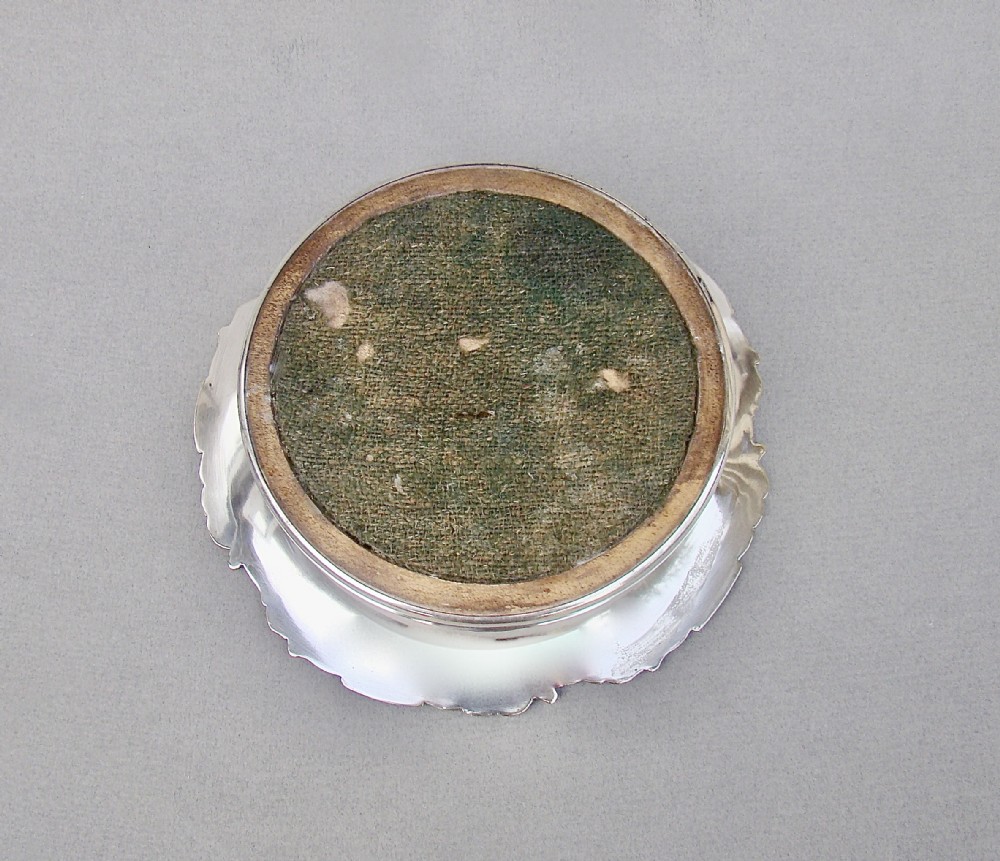 This is a very decorative decanter coaster by Thomas Wilkinson, a renowned Old Sheffield maker and later firm. Dating circa 1835, the everted sides applied with naturalistic twigs and fruiting vines, very much in the William IV style. The turned fruitwood base with a central silvered button. The underside with the original green baize. Hallmarks: TW for Thomas Wilkinson. Deer pictogram. Cross pictogram. Sheath of wheat pictogram. Number 3. Condition: Good. No base metal showing through, sit firmly, no wood distortion. Dimensions: Maximum diameter: 16cm / 6.4 inches. Height: 5cm / 2 inches. Delivery: PLEASE DO NOT FORGET TO ADD POSTAGE AT CHECKOUT. Postage UK: £5 Royal Mail Tracked 24. Postage overseas: £20 International Signed For. Postage USA (including US import duties): £45.00 You can pay by PayPal, bank transfer, cheque, debit or credit card. To pay by PAYPAL please add P&P and click on button below. To pay by credit or debit card over the phone or by cheque, please contact me on 01449 760 585. Internal Ref: MAR91
