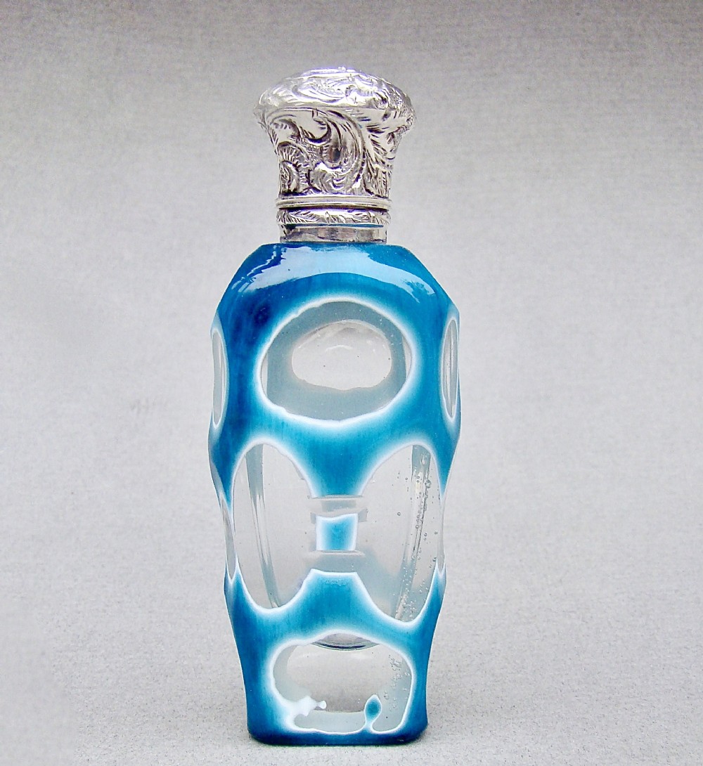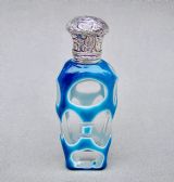 This fabulous overlay opaline glass silver mounted scent bottle dates circa 1890. The cut glass slender body a very rarely seen vivid turquoise colour cut to white opaline glass and then to clear glass with geometric patterns. The neck mounted with a beautiful embossed hinged silver lid and fitted with a clear glass stopper. Hallmarks: Unmarked, which was often the case with silver scent bottle lids but tested as silver. Dimensions: Height: 9cm - 3.6 inches. Maximum width: 3cm / 1.2 inches. Depth: 1.5 cm / 0.4 inches. Condition: Exvellent. Glass in very good condition. Inside of neck in excellent condition. No cracks. Silver lid in very good condition. Delivery: PLEASE DO NOT FORGET TO ADD POSTAGE AT CHECKOUT. Postage UK: £10.00 Royal Mail Special Delivery. Postage overseas: £25 International Signed For. PLEASE DO NOT FORGET TO ADD POSTAGE AT CHECKOUT. Postage UK: £10.00 Royal Mail Special Delivery. Postage overseas: £25 International Signed For. Postage USA (including US import duties): £45.00 You can pay by PayPal, bank transfer, cheque, debit or credit card. To pay by PAYPAL please add P&P and click on button below. To pay by credit or debit card over the phone or by cheque, please contact me on 01449 760 585. Internal Ref: MAR81