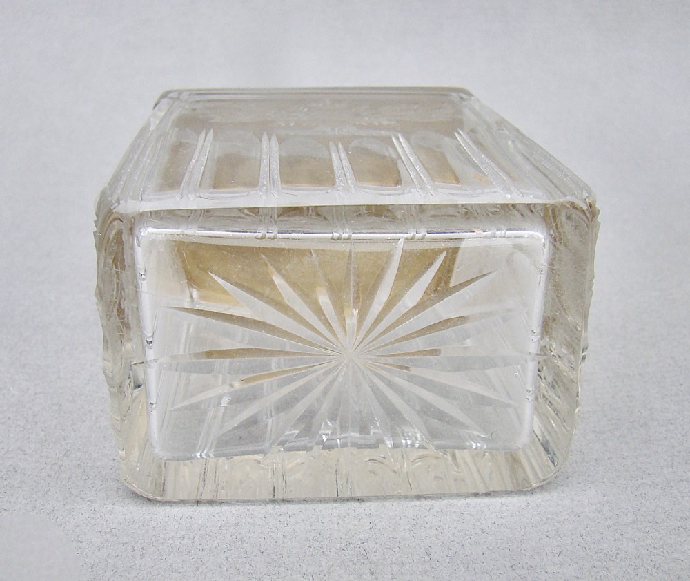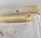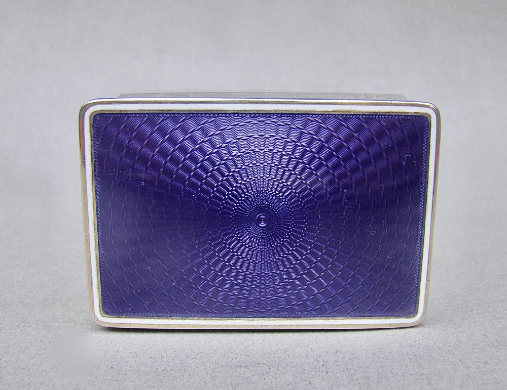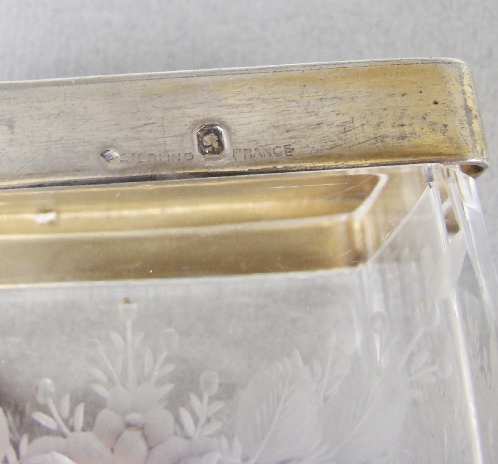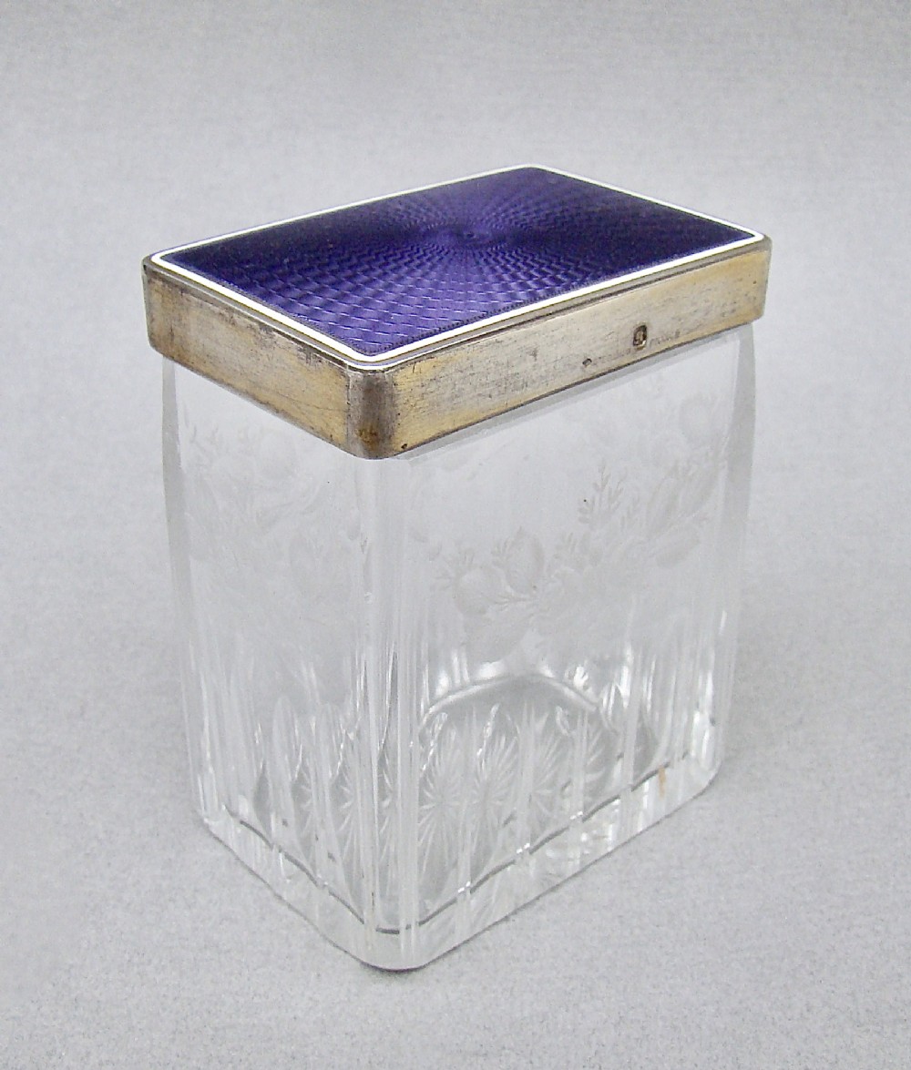 This superb quality silver gilt and lilac guilloche enamel rectangular dressing table jar bears French hallmarks and dates circa 1910. The exquisite dark lilac enamel pull-off lid with a delicate white enamel border. Fitted on a sliced-cut crystal glass body exquisitely etched with floral garlands. The glass with a silver gilt thread, a testament to the quality of the piece. The gilt lid border impressed with French hallmarks. The base star incised. Hallmarks: Minerva Head Impressed "Sterling France". Condition: Excellent. Enamel lid in excellent condition. Glass in perfect condition. No chips or cracks. Dimensions: Height: 8.5cm / 3.3 inches. Width: 6.5cm / 2.4 inches. Depth: 4.5cm / 1.6 inches. Postage: PLEASE DO NOT FORGET TO ADD POSTAGE AT CHECKOUT. Postage UK: £5 Royal Mail Tracked 24. Postage overseas: £20 International Signed For. Postage USA (including US import duties): £45.00 You can pay by PayPal, bank transfer, cheque, debit or credit card. To pay by PAYPAL please add P&P and click on button below. To pay by credit or debit card over the phone or by cheque, please contact me on 01449 760 585. Internal Ref: MAR80