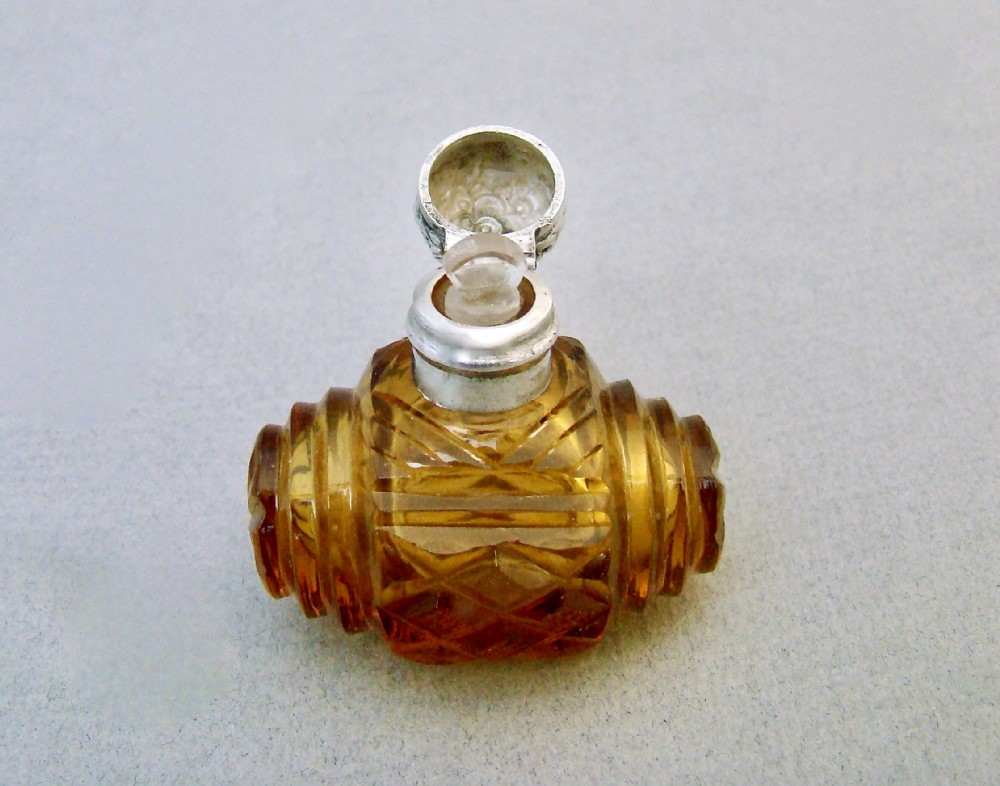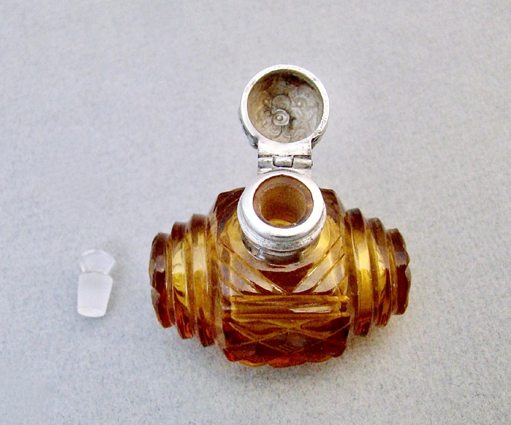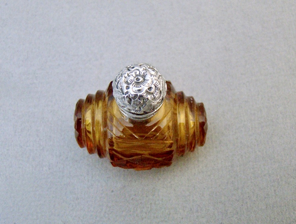 This delightful silver and cut glass scent bottle dates circa 1880. The rich barrel shaped amber coloured body sliced-cut in diamond and concentric patterns. The neck fitted with an embossed hinged silver lid, the neck with clear glass stopper. Hallmarks: Unmarked as it was very often the case with scent bottle lids but tested as silver. Dimensions: Height: 4.5cm / 1.6 inches. Width: 4.5cm / 1.6 inches. Depth: 3cm / 1 inch. Condition: Excellent.. No dings or dents, no holes to the lid. Inner glass neck in perfect condition. Glass stopper in good condition. Delivery: PLEASE DO NOT FORGET TO ADD POSTAGE AT CHECKOUT. Postage UK: £5 Royal Mail Tracked 24. Postage overseas: £20 International Signed For. Postage USA (including US import duties): £45.00 You can pay by PayPal, bank transfer, cheque, debit or credit card. To pay by PAYPAL please add P&P and click on button below. To pay by credit or debit card over the phone or by cheque, please contact me on 01449 760 585. Internal Ref: MAR77