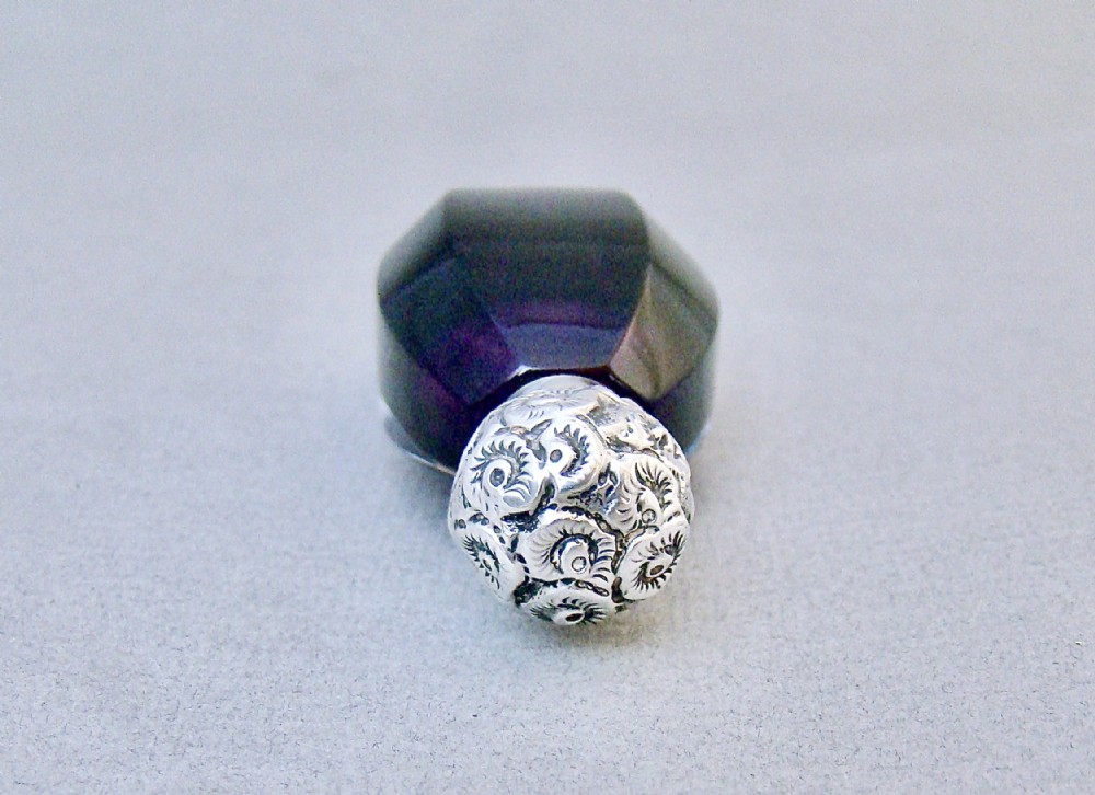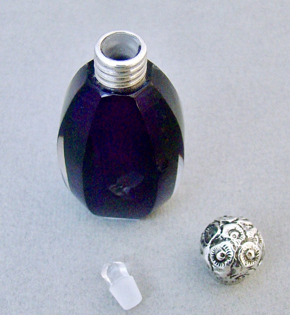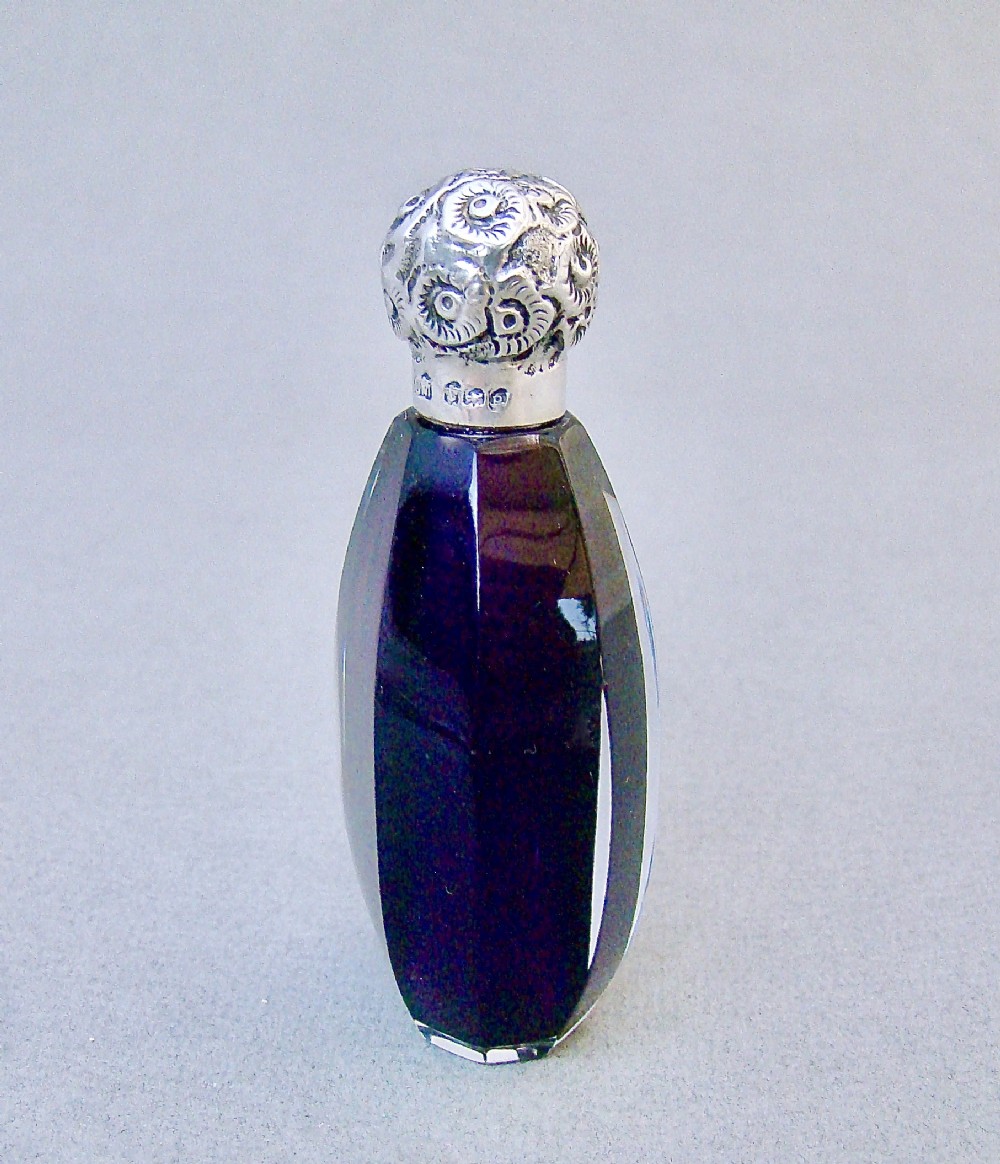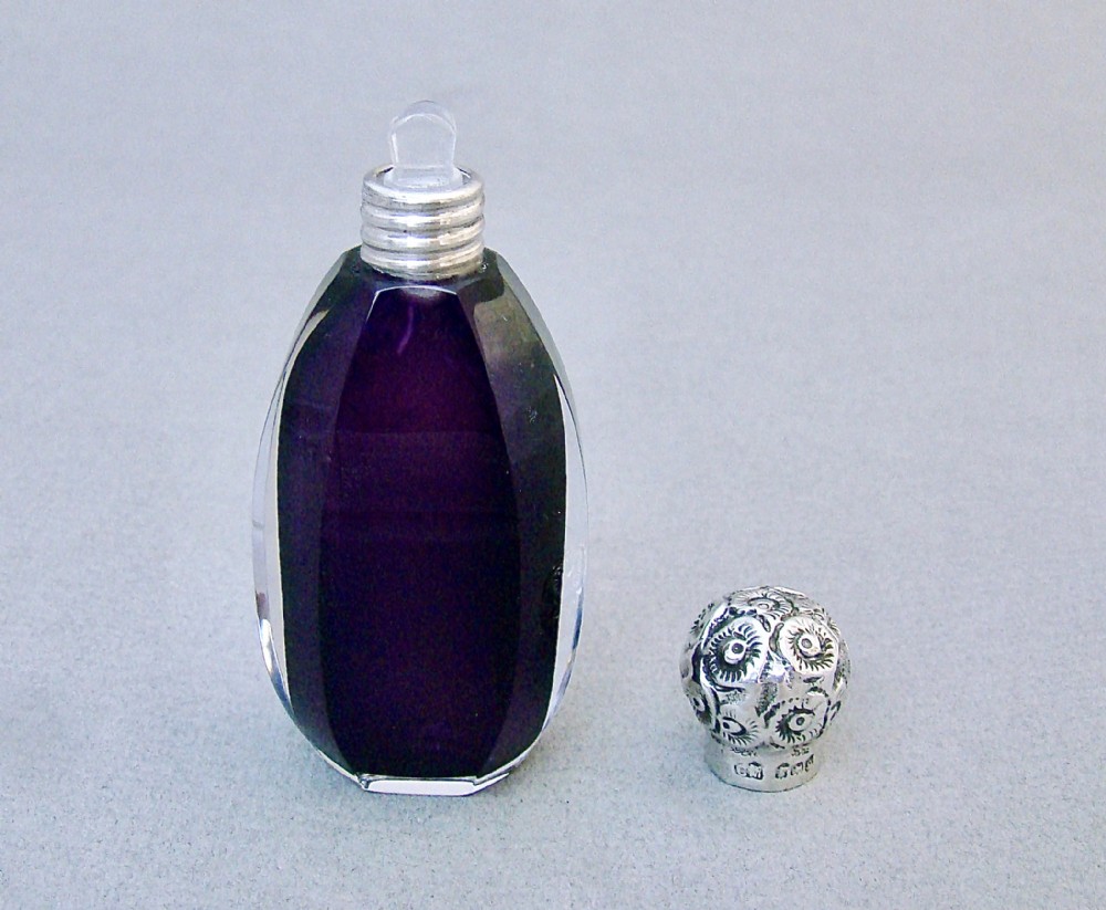 EXQUISITE EDWARDIAN SILVER AND AMETHYST GLASS SCENT BOTTLE BY CHARLES MAY, BIRMINGHAM 1901