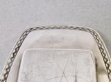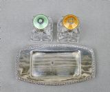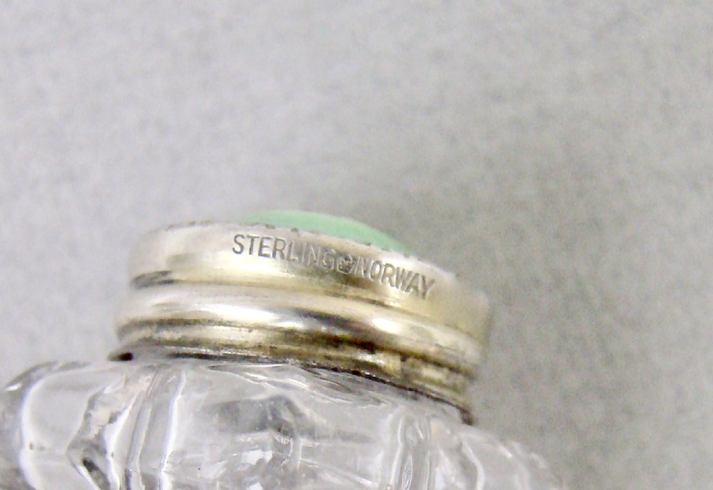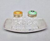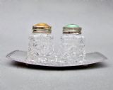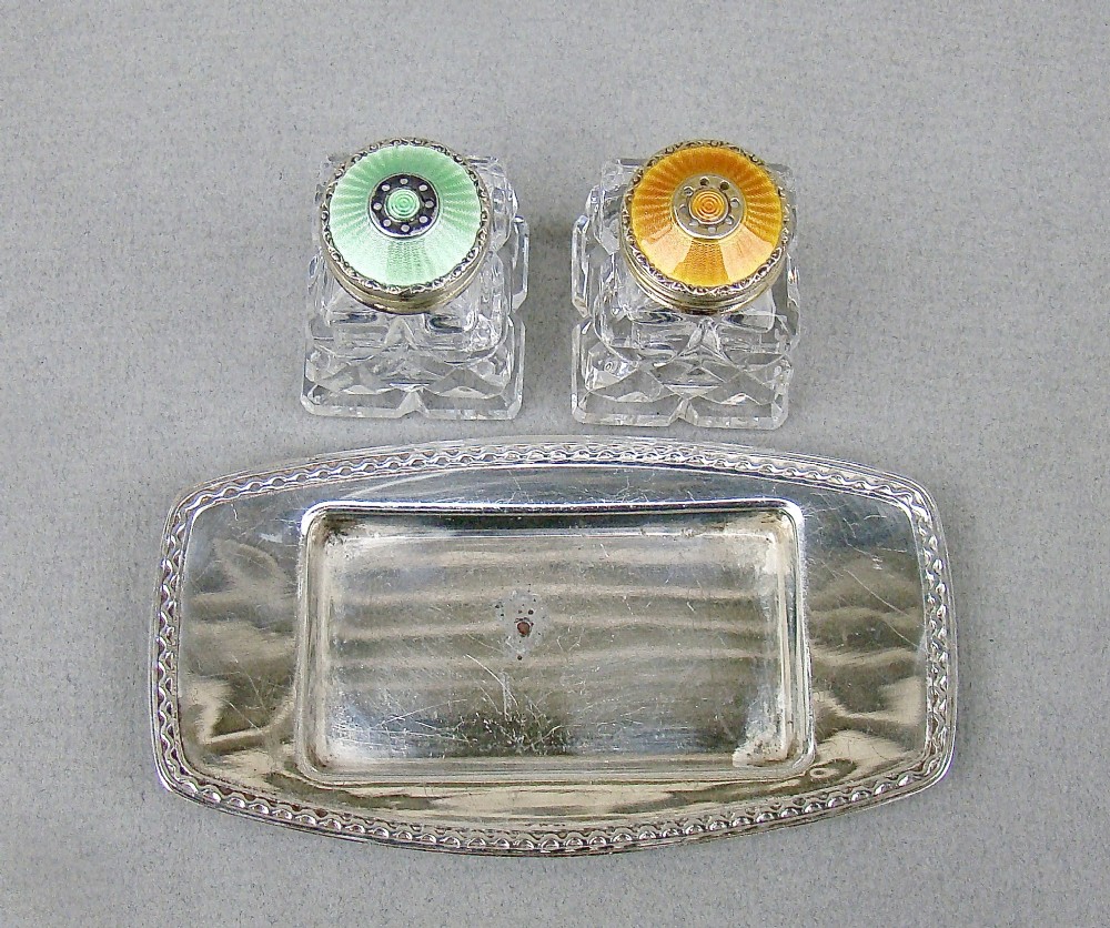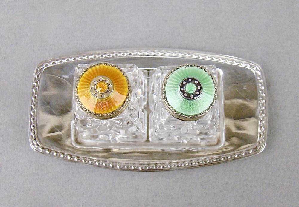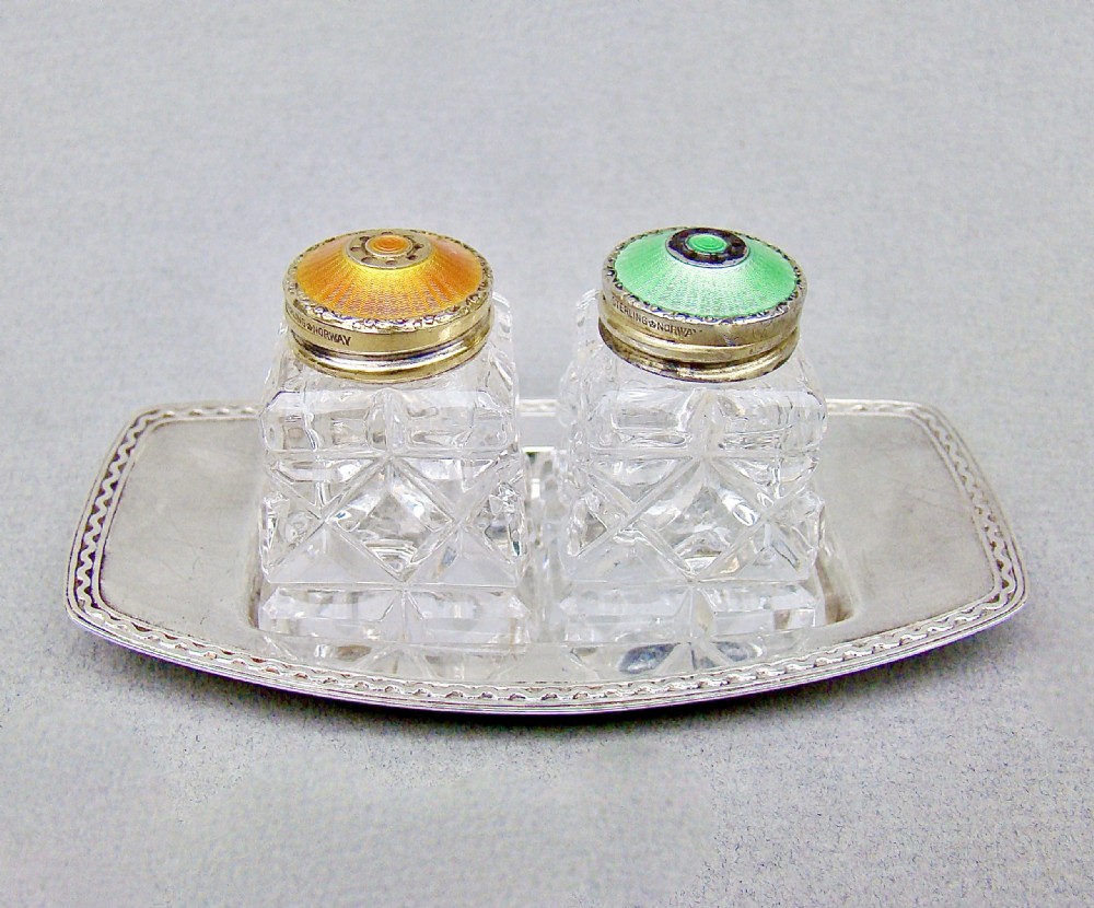 pair of norwegian art deco silver and enamel salts on silver stand circa 1930