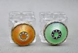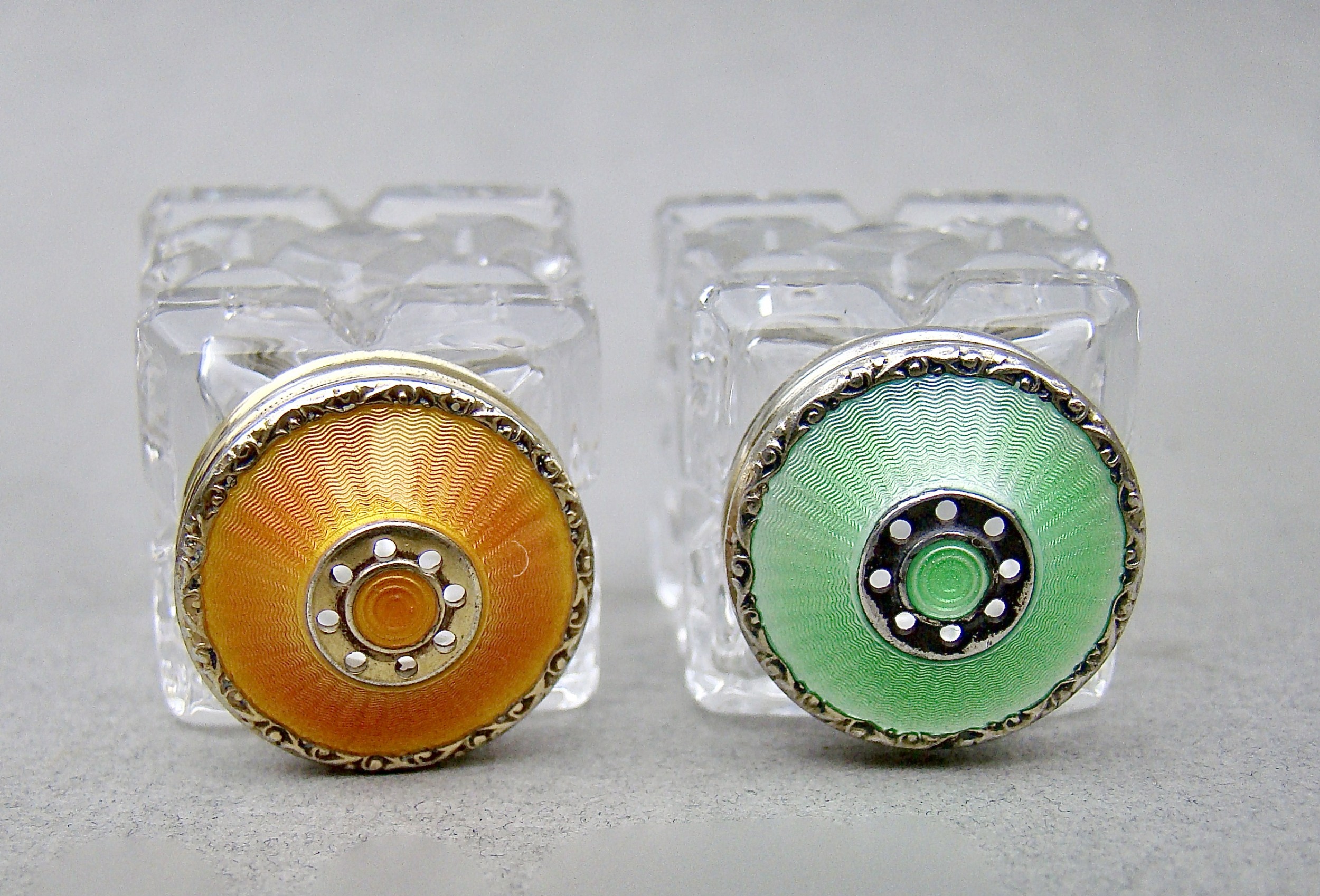 This is a delightful pair of Norwegian silver gilt and guilloche enamel miniature salts. Dating circa 1930, Each tapered sliced-cut glass body with a screw-top silver and guilloche enamel lid. Both a lovely colours that complement each other well. Presented on their original silver stand.