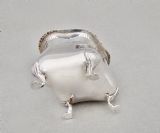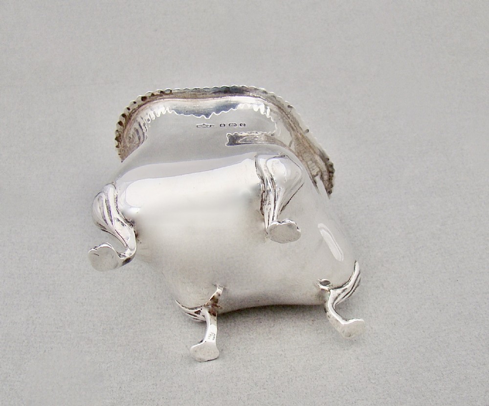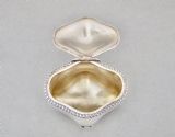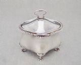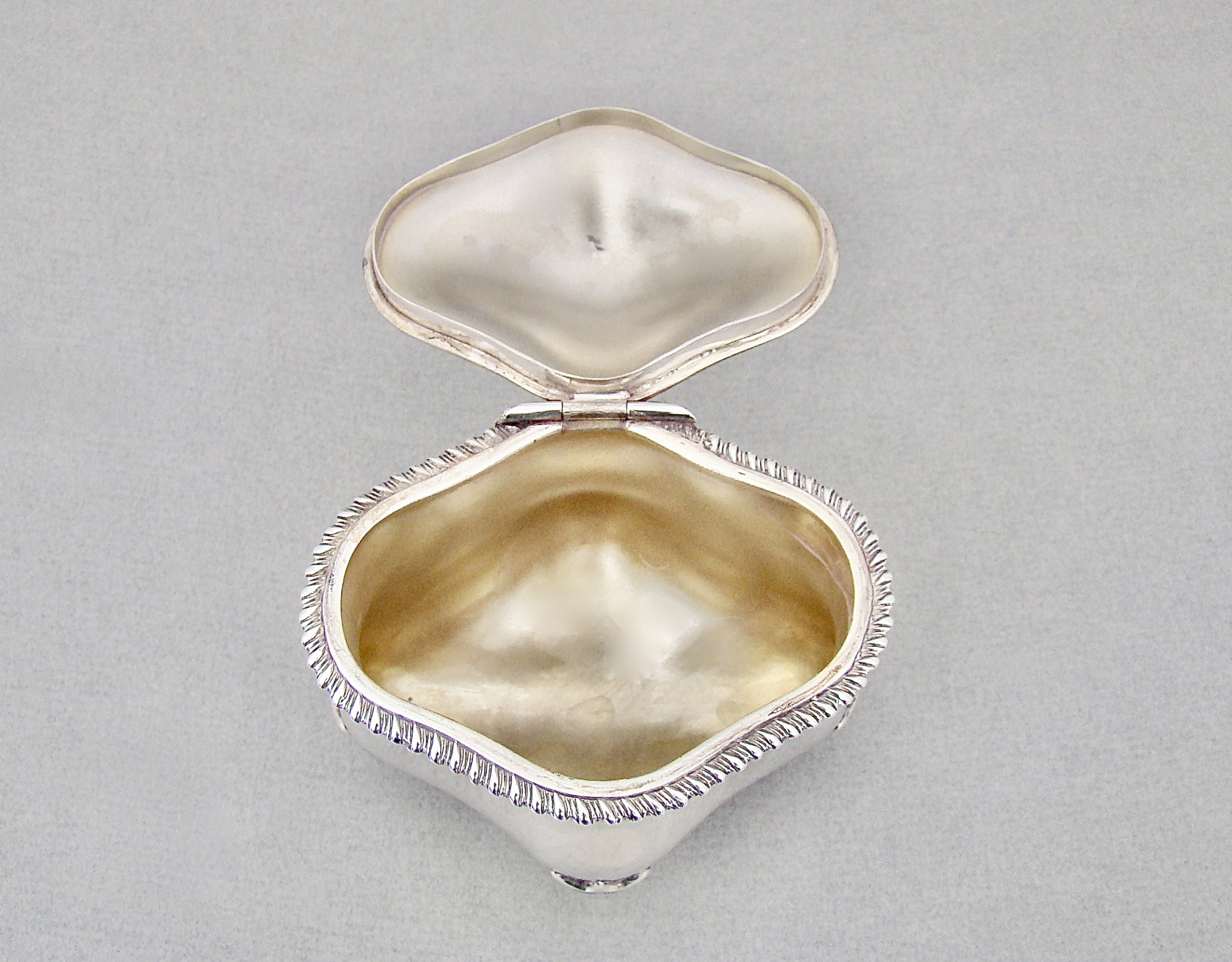 This charming and unusual Edwardian silver tea caddy is dated Birmingham 1902 and bears the marks of Marples and Co. It is a very tactile piece with its organic oblong shape and slightly domed hinged cover. The cover with an elgant gadroon border and drop-ring handle, the base raised o four scroll-capped trefoil feet. The interior with original pale gilt wash. A gorgeous and unusual tea caddy. Hallmarks: M&Co for Marples & Co. Lion Passant. Birmingham Assay Mark. Date letter "c" for 1902. Dimensions and Weight: Height up to finial:11cm / 4.4 inches Width: 10cm / 3.6 inches. Depth: 7cm / 3 inches. Weight: 161g / 5.7oz. Condition Very good. No dings. No dents. No repairs. PLEASE DO NOT FORGET TO ADD POSTAGE AT CHECKOUT. Postage UK: £5 Royal Mail Tracked 24. Postage overseas: £20 International Signed For. Postage USA (including US import duties): £45.00 You can pay by PayPal, bank transfer, cheque, debit or credit card. To pay by PAYPAL please add P&P and click on button below. To pay by credit or debit card over the phone or by cheque, please contact me on 01449 760 585. Internal Ref: AVR99