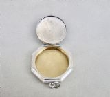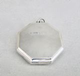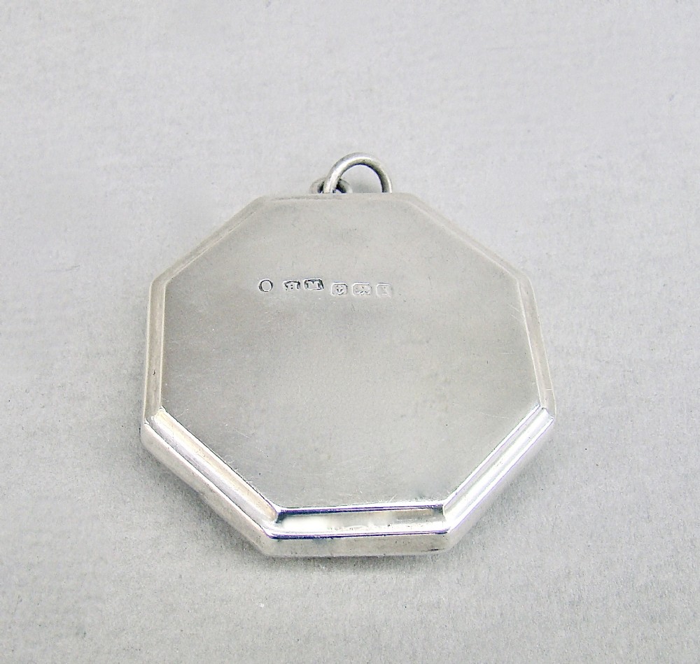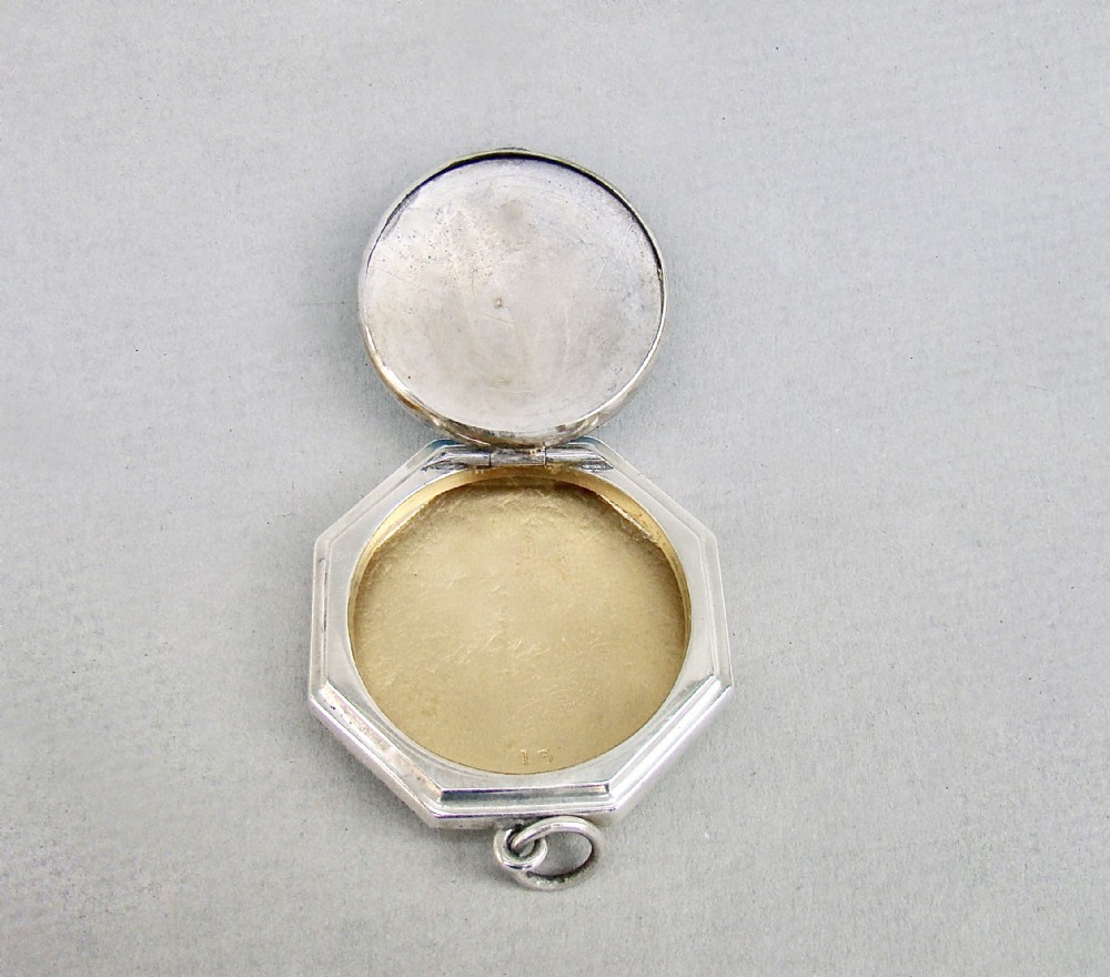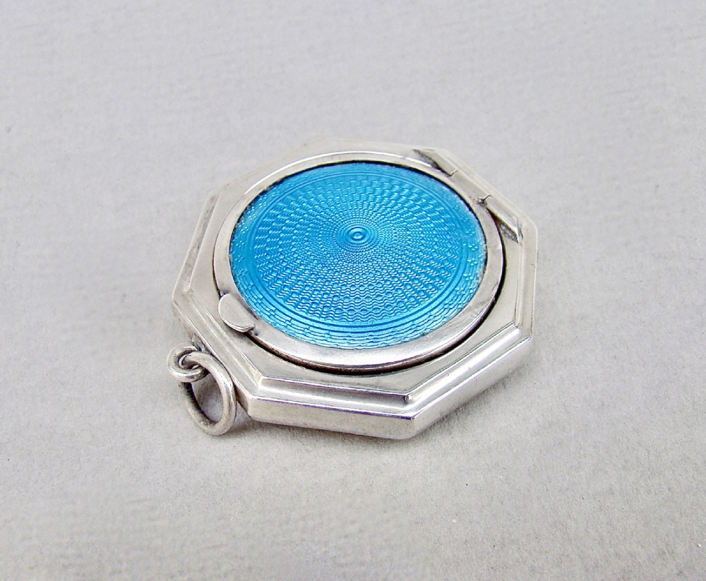 This delightful silver and guilloche compact was made in Birmingham in 1922 by the renowned Henry Matthews. Of octagonal form, the front decorated with a vibrant turquoise colour enamel cabochon. The hinged lid opening to reveal a gilt interior. Attachment ring for a chain. Hallmarks: HM for Henry Matthews. Date letter "x" for 1922. Birmingham Assay mark. Lion passant. Condition: Good Enamel in very good conditIon. A couple of Strong hinge. Good clear hallmarks. Back with minor surface wear commensurate with age and use Dimensions: Diameter: 4.5cm / 1.6 inches Delivery: PLEASE DO NOT FORGET TO ADD POSTAGE AT CHECKOUT. Postage UK: £5 Royal Mail Tracked 24 Postage overseas: £15 International Signed For. You can pay by PayPal, bank transfer, cheque, debit or credit card. To pay by PAYPAL please add P&P and click on button below. To pay by credit or debit card over the phone or by cheque, please contact me on 01449 760 585. Internal Ref: AVR92