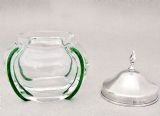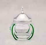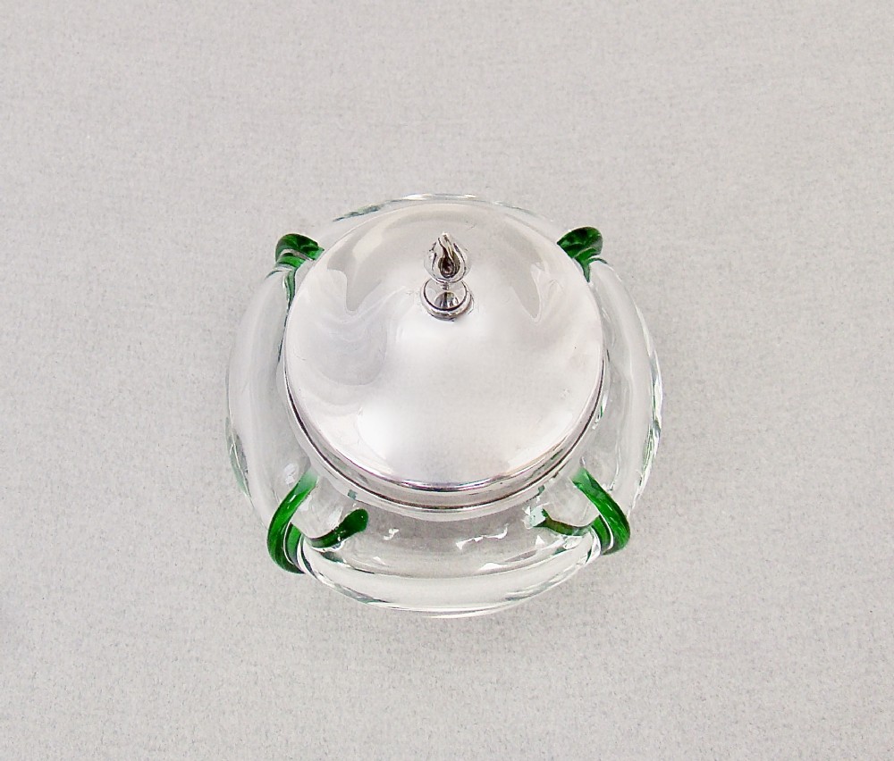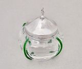This delightful Edwardian silver silver lidded trailed glass vanity jar was made in London 1901 by the reputed Robert Pringle & Sons. The plain silver lid with flame finial fitted on an elegant trailed glass compressed circular body. Hallmarks: R.P for Robert Pringle & Sons. London Assay mark. Lion passant. Date letter "f" for 1901. Condition: Very good. Glass in perfect condition. Postage: PLEASE DO NOT FORGET TO ADD POSTAGE AT CHECKOUT. Postage UK: £5 Royal Mail Tracked 24. Postage overseas: £20 International Signed For. Postage USA (including US import duties): £45.00 You can pay by PayPal, bank transfer, cheque, debit or credit card. To pay by PAYPAL please add P&P and click on button below. To pay by credit or debit card over the phone or by cheque, please contact me on 01449 760 585. Internal Ref: AVR88