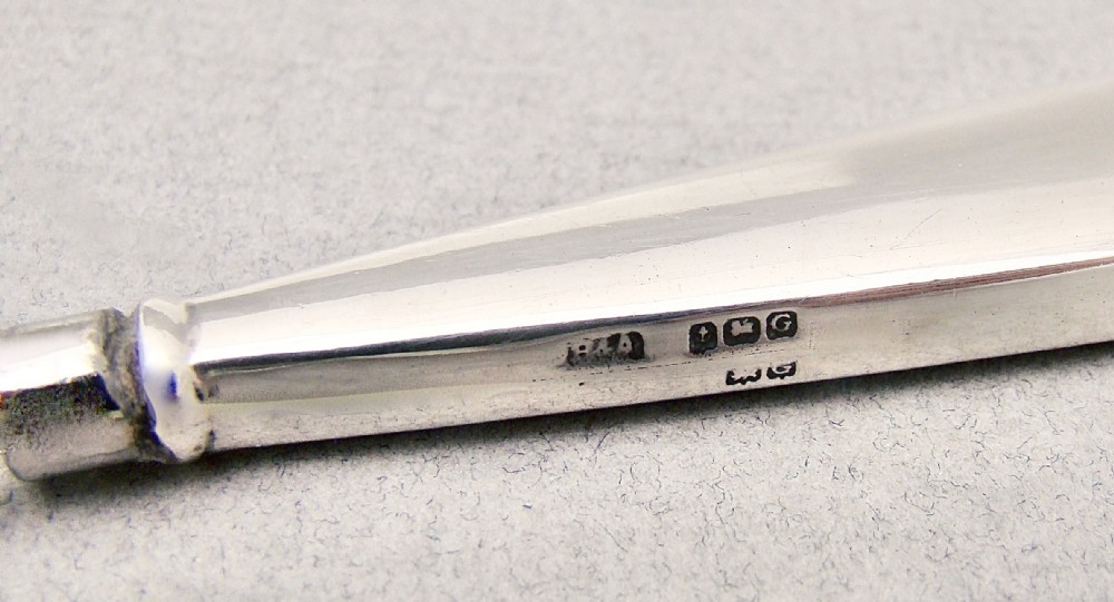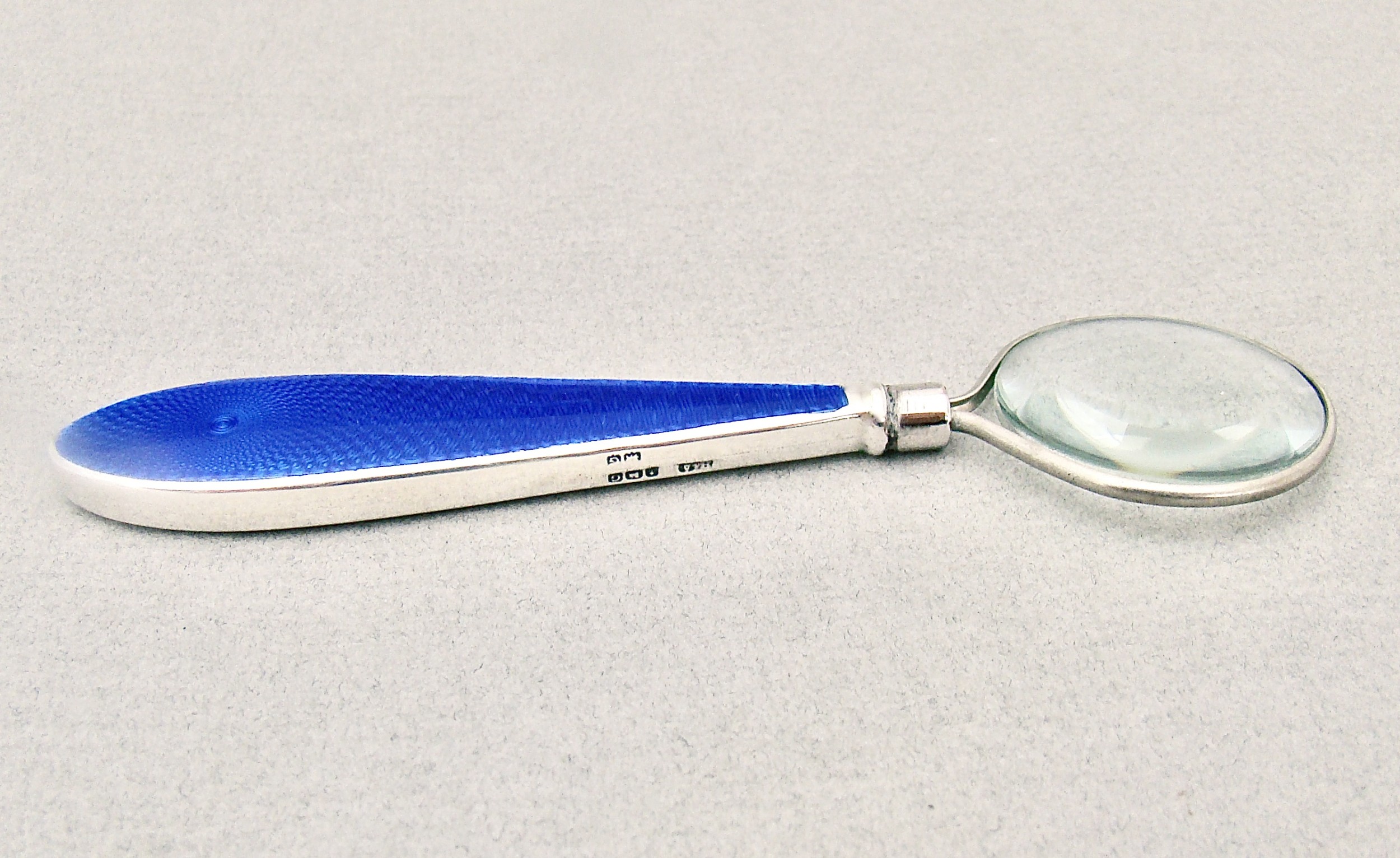 This is a small and very sweet little desk magnifying glass. It has a silver mounted Royal blue guilloche enamel handle, the engine turned enamel inset present on one side of the handle, the other sided plain. Mounted with a 3.5cm diameter steel mount inset with magnifying glass. Hallmarks: B&Co for W I Broadway & Co. Birmingham Assay Mark. Lion Passant. Date letter "G" for 1931. Condition: Good. Handle in good condition, no loss, no repairs. Glass with no surface scratching. Silver in very good condition. Dimensions: Length 12cm / 4.6 inches. Glass diameter: 4 cm / 1.6 inches. Postage: PLEASE DO NOT FORGET TO ADD POSTAGE AT CHECKOUT. Postage UK: £5 Royal Mail Tracked 24. Postage overseas: £20 International Signed For. Postage USA (including US import duties): £45.00 You can pay by PayPal, bank transfer, cheque, debit or credit card. To pay by PAYPAL please add P&P and click on button below. To pay by credit or debit card over the phone or by cheque, please contact me on 01449 760 585. Internal Ref: AVR87