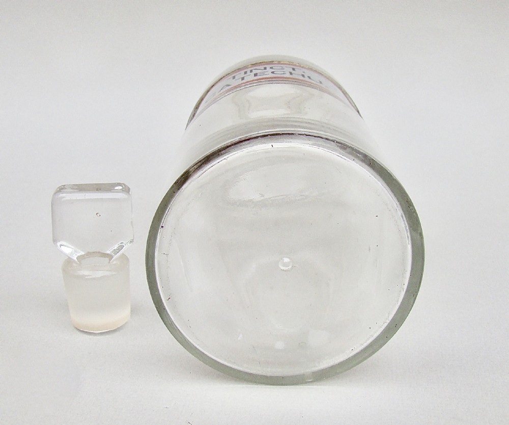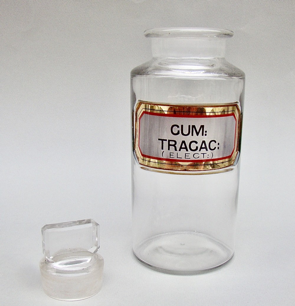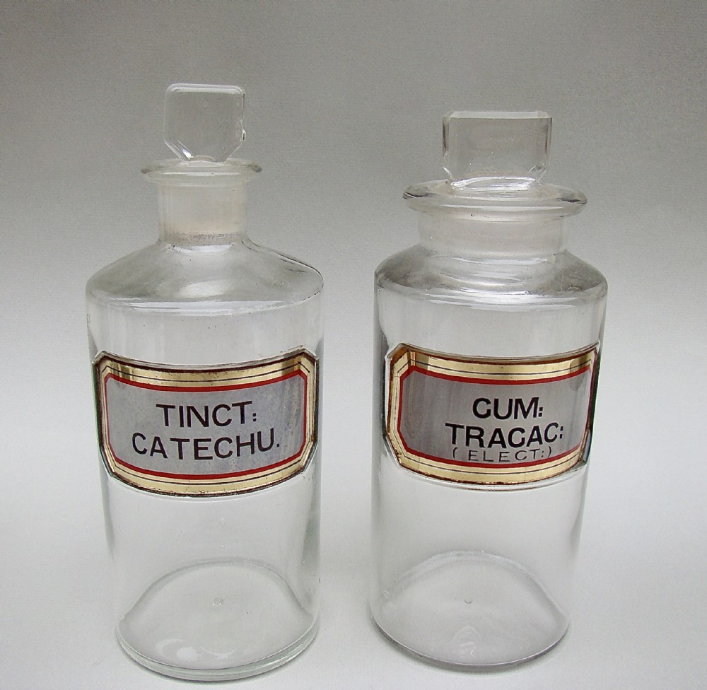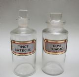 This is an unusual and rather striking pair of Victorian Apothecary bottles. Each with a gilt and red edged Latin label on a grey background. Each with their original stopper.