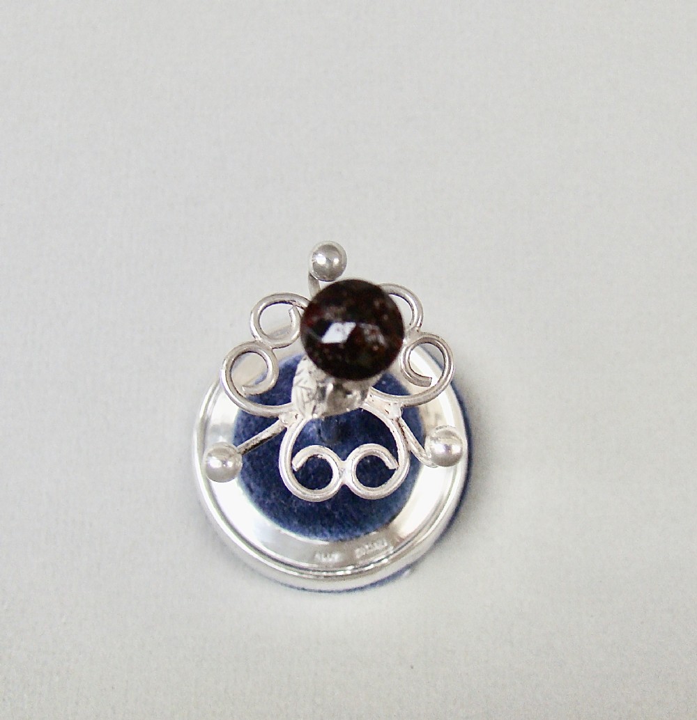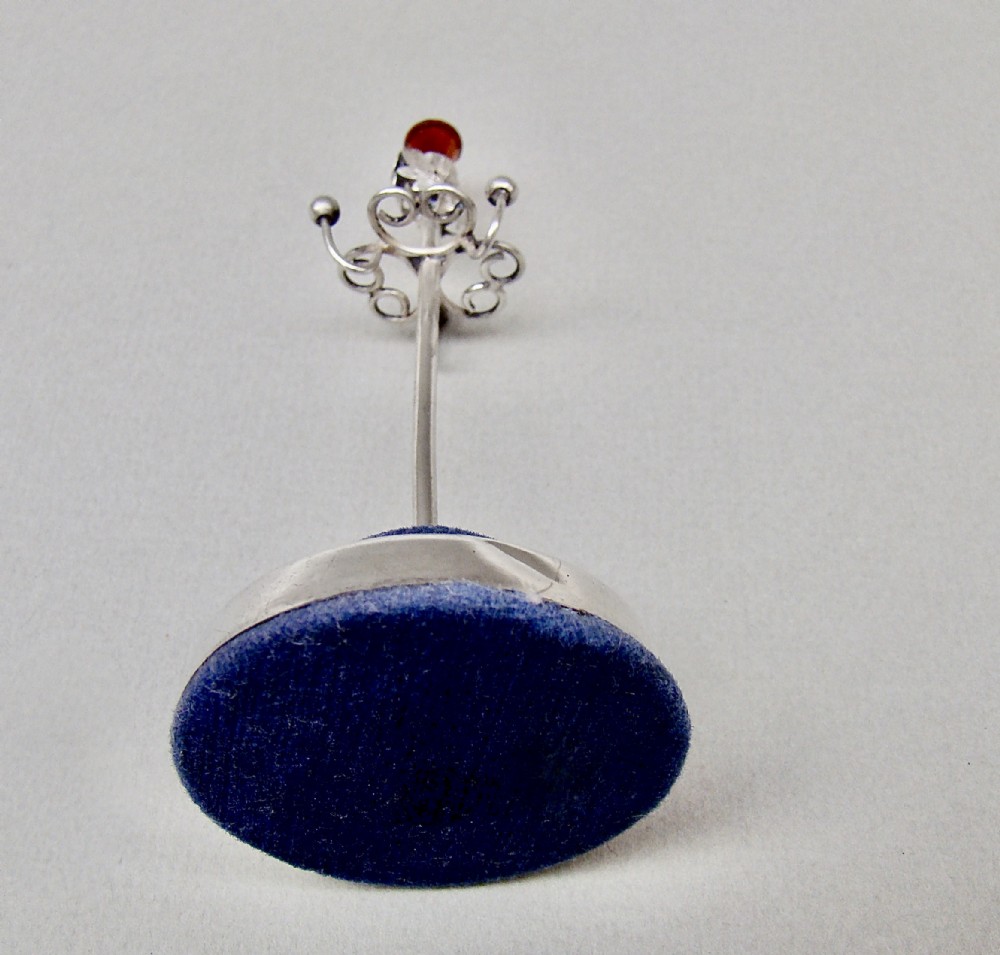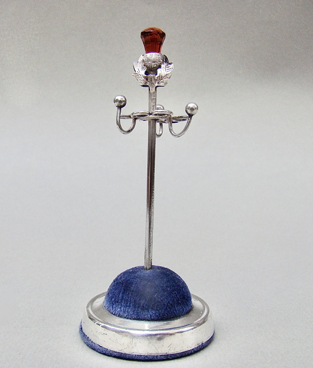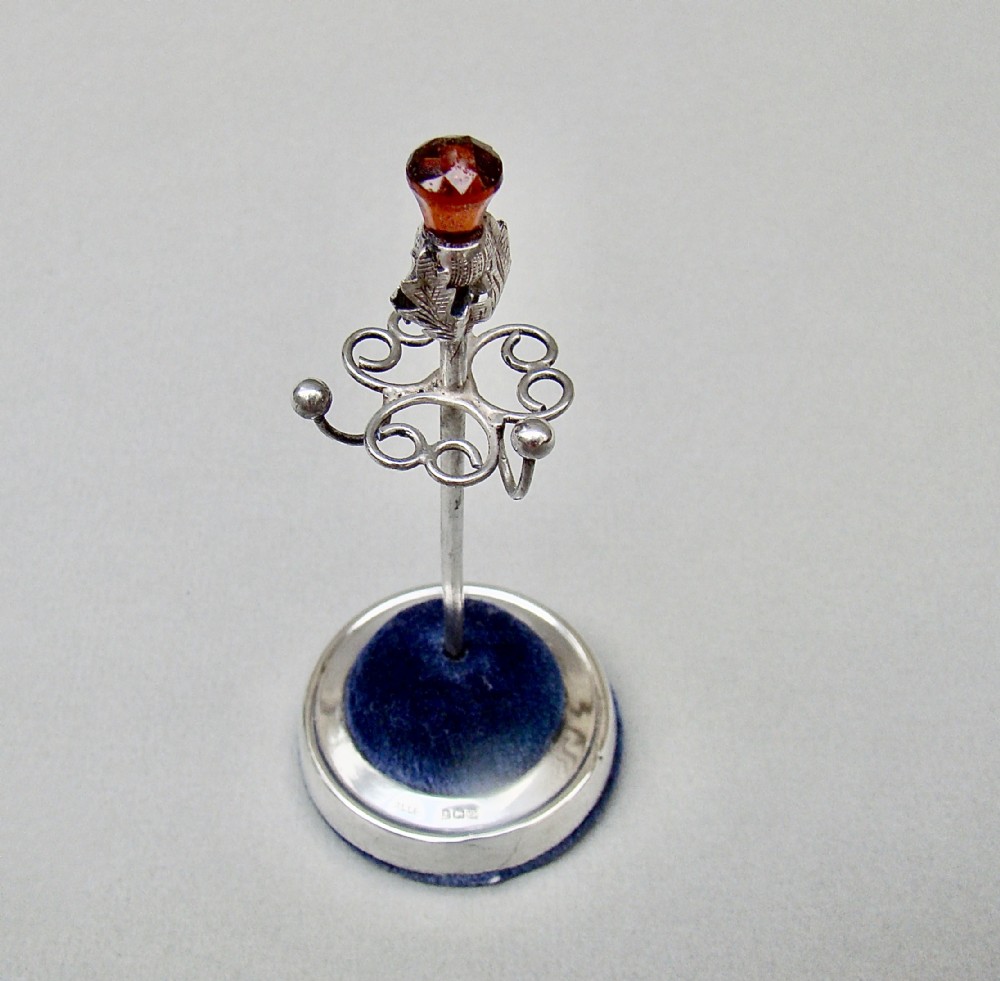 This exquisite solid silver ring tree made by Adie & Lovekin and dated Birmingham 1922. The plain circular loaded base with a central stem. The stem with a terminal modelled as a thistle and inset with an amber glass finial. The textured terminal with three ring hooks emanating from heart-shaped wirework frames.