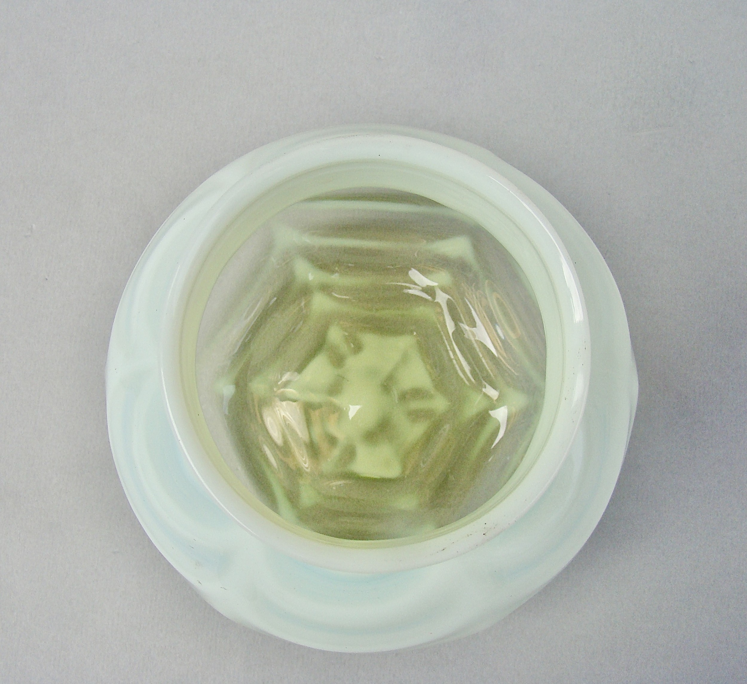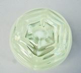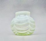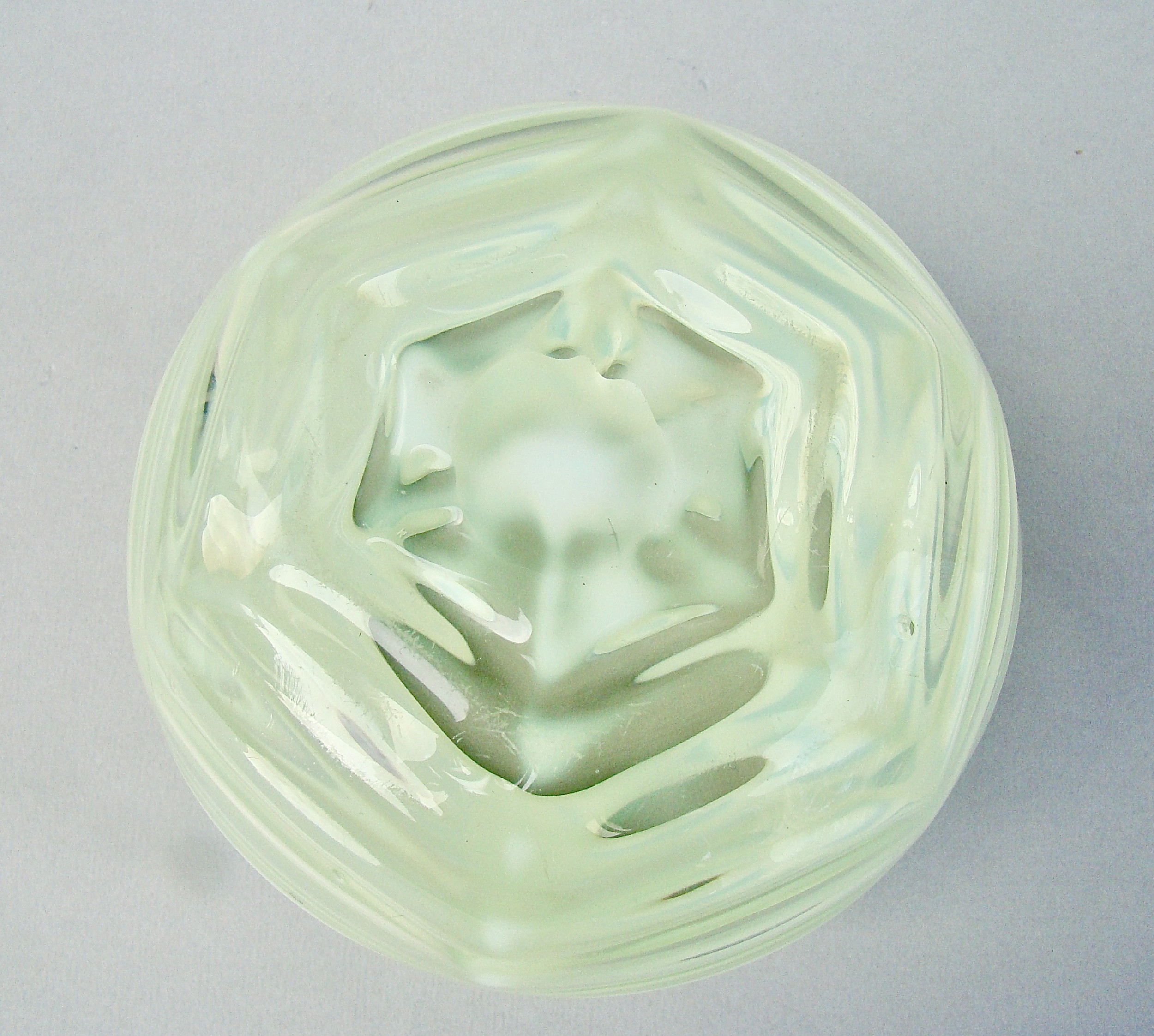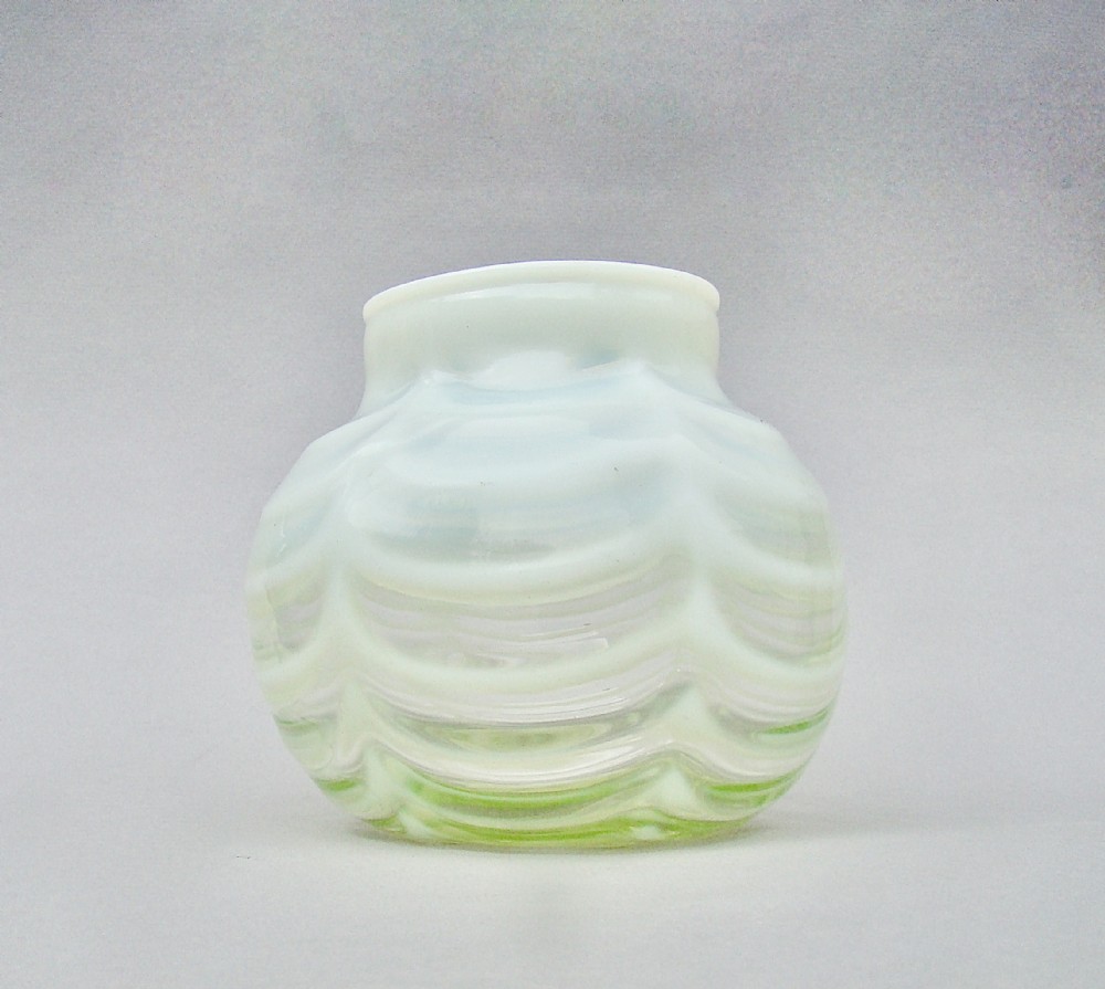 This delightful vaseline uranium glass specimen vase dates circa 1890. The moulded spherical body graduating from a pale vaseline opalescent colour to a vivid yellow uranium colour at the base. The surface with a striking swirl pattern