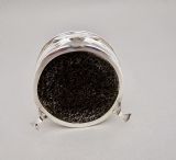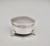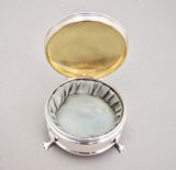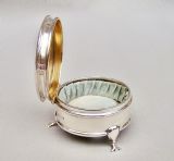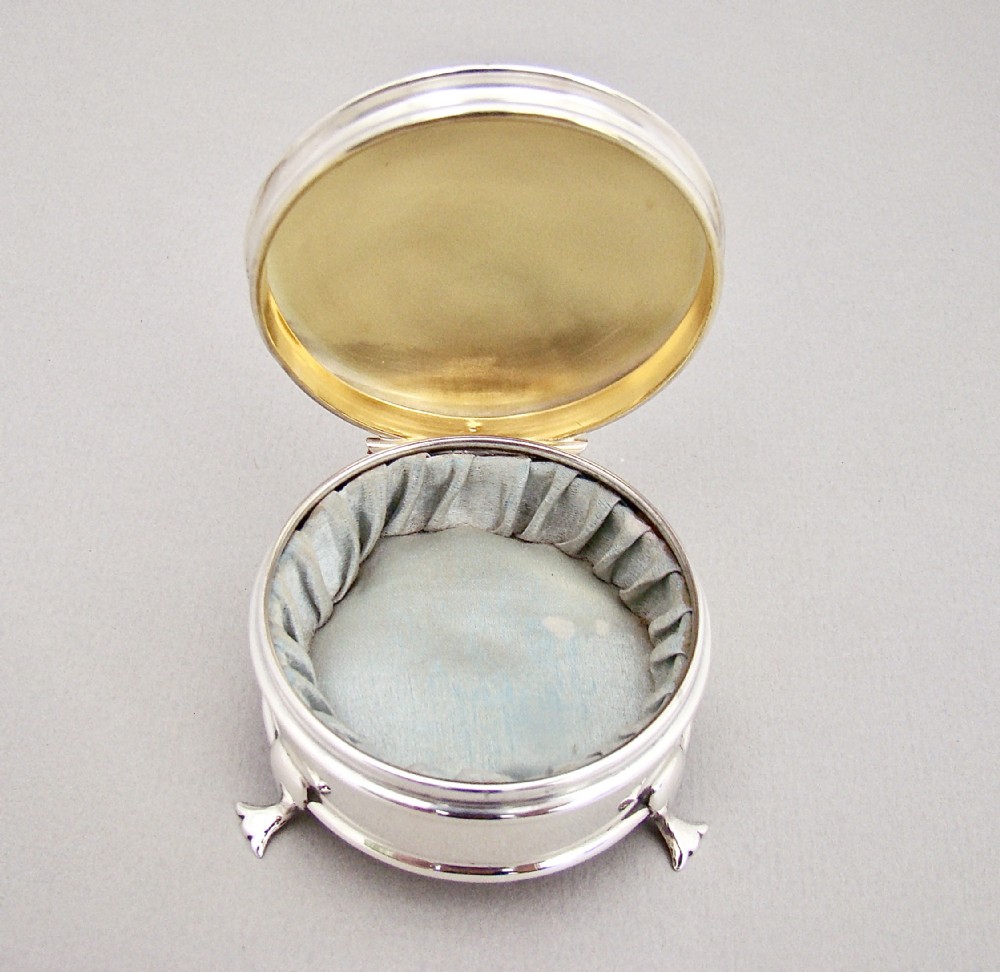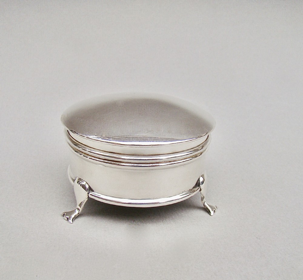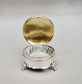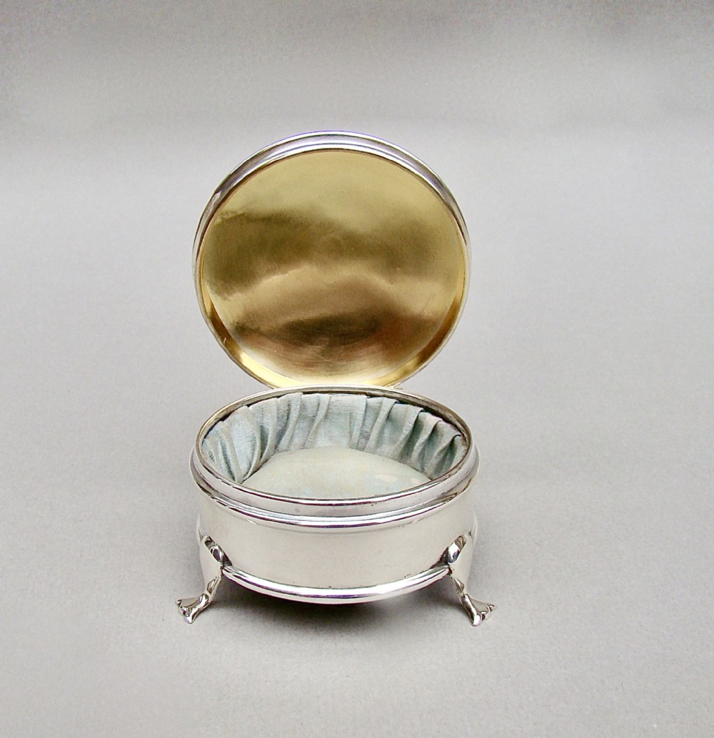 This small and elegant George V silver jewellery box was made by the prolific silversmiths A&J Zimmerman and is dated Birmingham 1913. The domed circular cover opening to reveal a gilt inner lid and original pale duck-egg blue silk interior. The plain circular body raised on three cabriole legs. The underside with a black Morocco leather base.