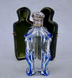 This is a rare and exquisite Victorian silver mounted sliced-cut teal coloured glass scent bottle. Thebaluster glass body very finely sliced-cut , the front and back panles decorated in criss cross patterns. The hinged silver lid engraved with initials and the date 1848.. Fitted with a clear glass stopper.