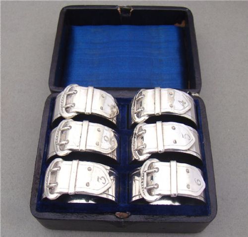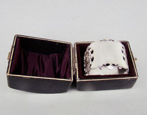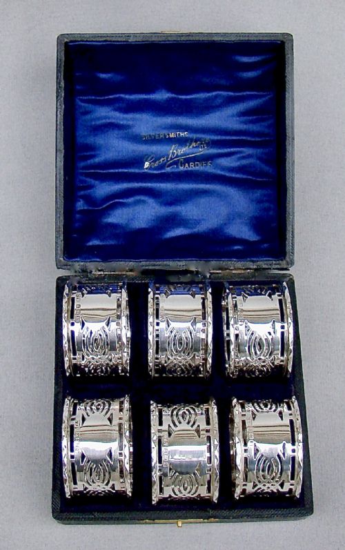 This elegant matched cased set of Edwardian silver napkin rings bear the marks of Broadway & Co. Of circular form, each napkin pierced with geometric patterns. They are presented in a leather case, with a Royal blue satin interior. They are light and delicate and are dated 1907 and 1910. Two are slightly higher than the other four, hence they are a matched set, this is reflected in the price.
