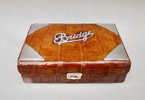 The beautiful crocodile leather is applied with the word Bridge in silver letters. The plain silver corners separately hallmarked The steel clasp is fully functioning. Original moire silk interior. The box contains four complete sets of playing cards, a patience games booklet and pencils.