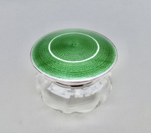 This stunning Art Deco silver and vivid yellow guilloche enamel jar is dated Birmingham 1934. It bears the retailers marks of J.C. Vickery, of 145 Regent Street in London and was made by William Neale & Son Ltd. The exquisite sunburst patterned guilloche enamel lid with solid silver stepped finial, very much in the Art Deco manner.