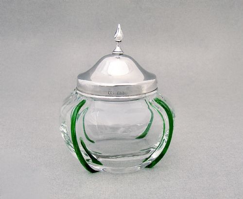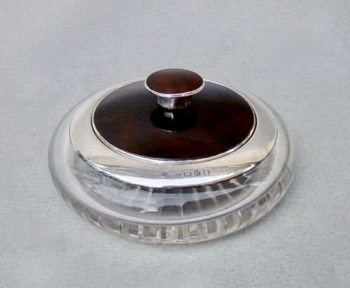 This stylish silver mounted dressing table jar is dated Birmingham 1936 and bears the marks of the Adie Brothers. Of compressed circular form, with a hallmarked silver rim and silver mounted tortoiseshell lid and finial. The glass with star-cut base and the inner lid fitted with the original mirror.