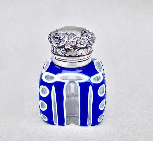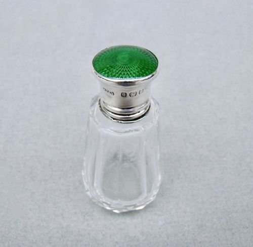 This unusual and rather elegant small Art Deco silver scent bottle is hallmarked for London 1921 and bears the marks of Henry Perkins & Sons. The panelled glass body fitted with a silver screw top lid. The lid inset with a vibrant green, sunburst pattern, glass cabochon. The neck with clear glass stopper.